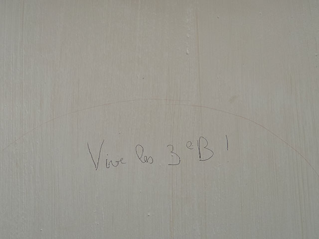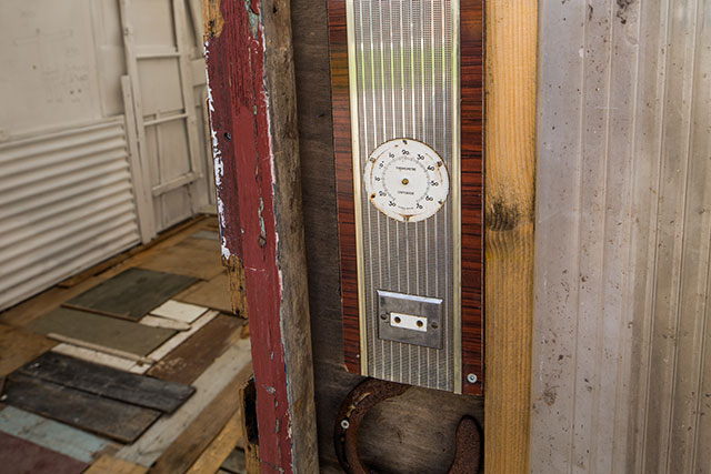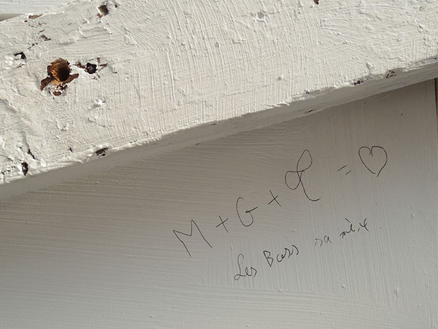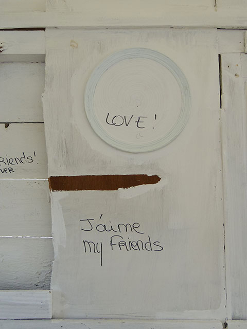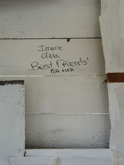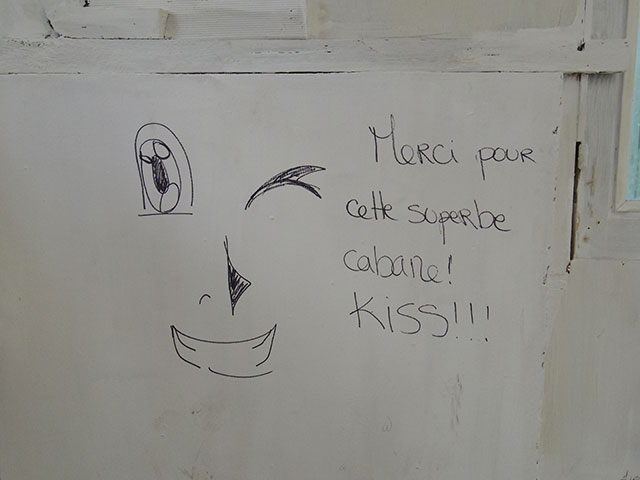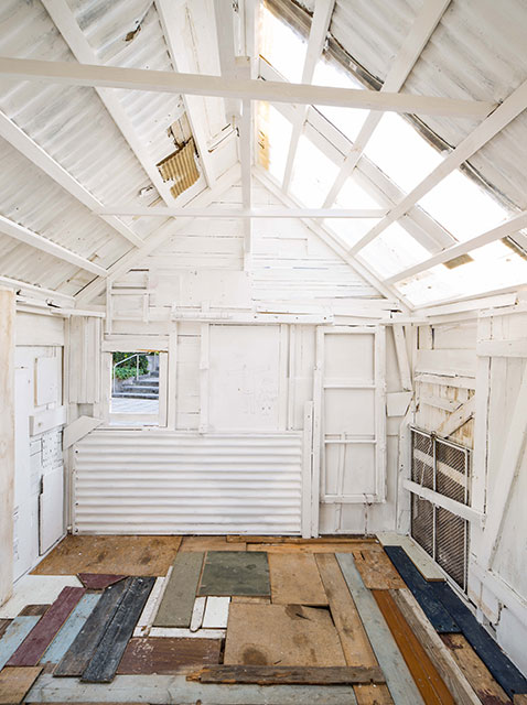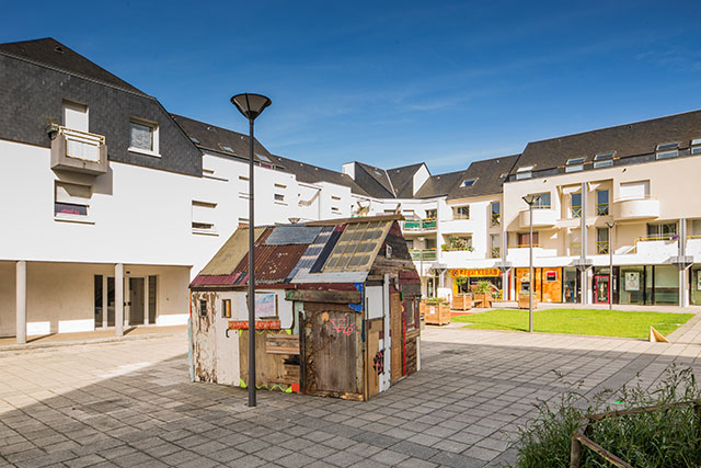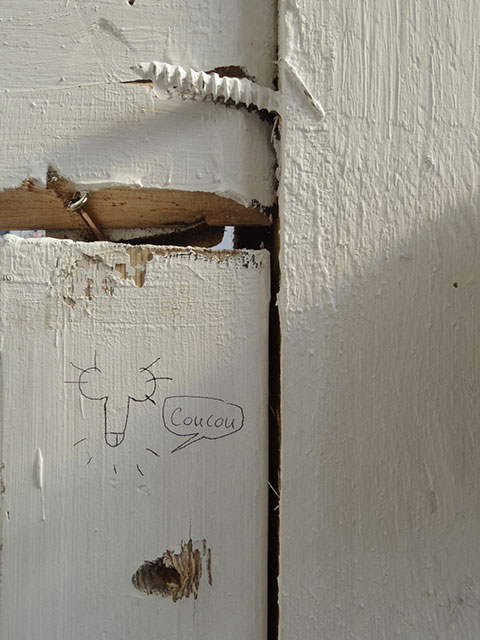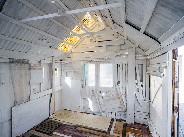 Pour Vern Volume, la jeune artiste brestoise érige une architecture à partir de fragments d’abris de provenances diverses. Le motif de la cabane est récurrent dans son travail. Tour à tour refuge solitaire au fond des bois, cabanon de plage ou de jardin, abri de fortune ou cachette des enfants, elle apparaît toujours comme un lieu en marge de societé, des lois, de la réalité, du monde des adultes et s’avère propice au déploiement de l’imaginaire. L’œuvre convoque de ce fait de multiples univers, fictifs ou terriblement réels, comme celui de la ” Folle de Saint-Lunaire “, dont l’unique occupation était de renforcer et de multiplier les murs de son habitation. La cabane d’Anaïs Touchot abrite ainsi près d’une centaine d’histoires de vies et son intérieur repeint en blanc propose d’acceuillir, telle une page ou une toile vierge, des narrations qui restent à formuler.