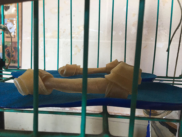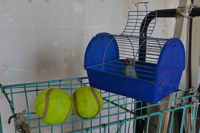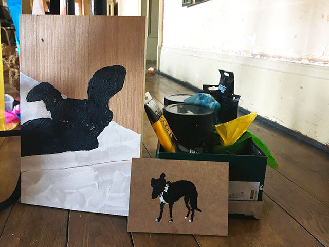Poop bags, kibble, chew bones, soles, tennis balls, bird cage, leashes, tea towels, hamster cage, dog trinket, “magic tree” deodorants, Tupperware, jars, string, paintbrushes, drawing clips, paints acrylics, painted wood panels, mud dog.