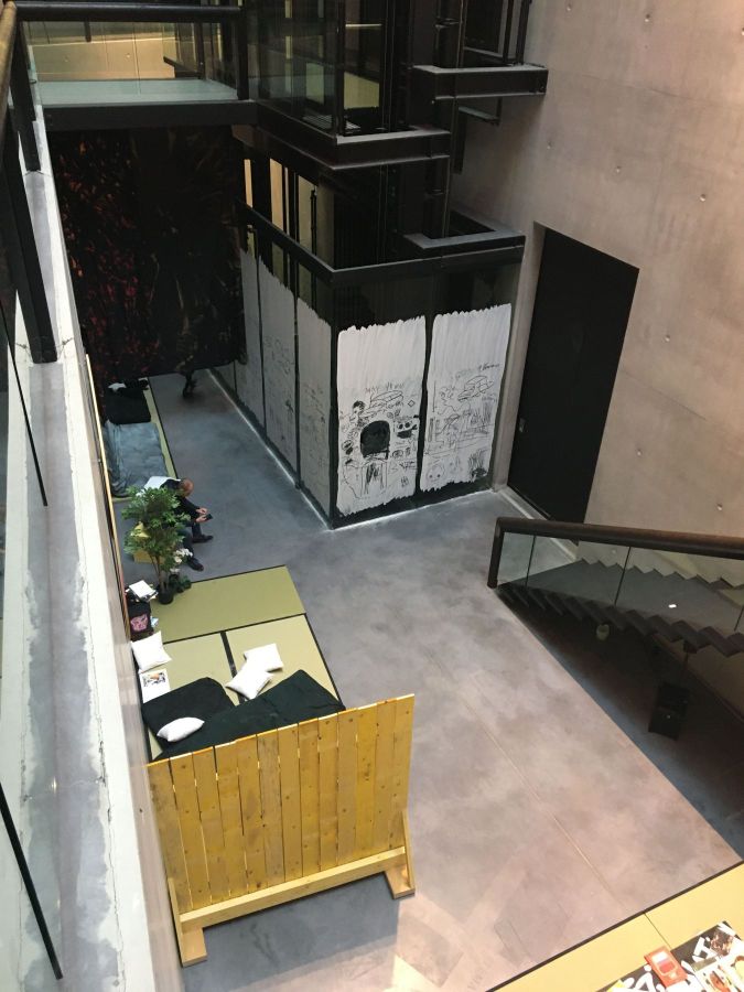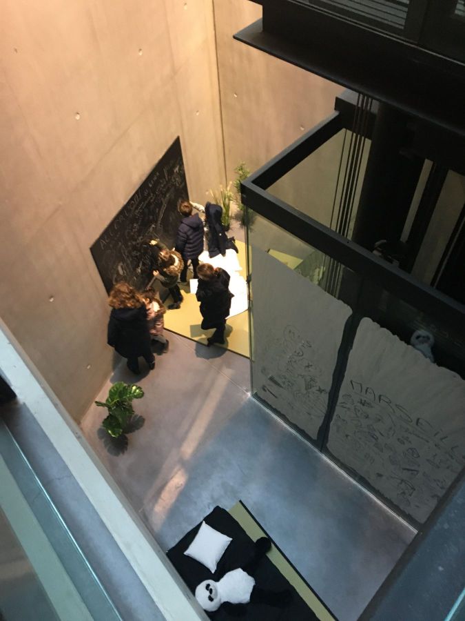 Le Canyon : L’espace dit du « puits de lumière » s’est transformé en 2019 en « canyon », espace hybride entre plateforme d’expérimentation artistique et espace pédagogique. Il est habité par l’installation praticable « le Pédilove » d’Anaïs Touchot. C’est un lieu convivial et modulable qui favorise le débat et l’expérience collective comme individuelle - il est équipé de tables, d’assises, de ressources documentaires, etc.