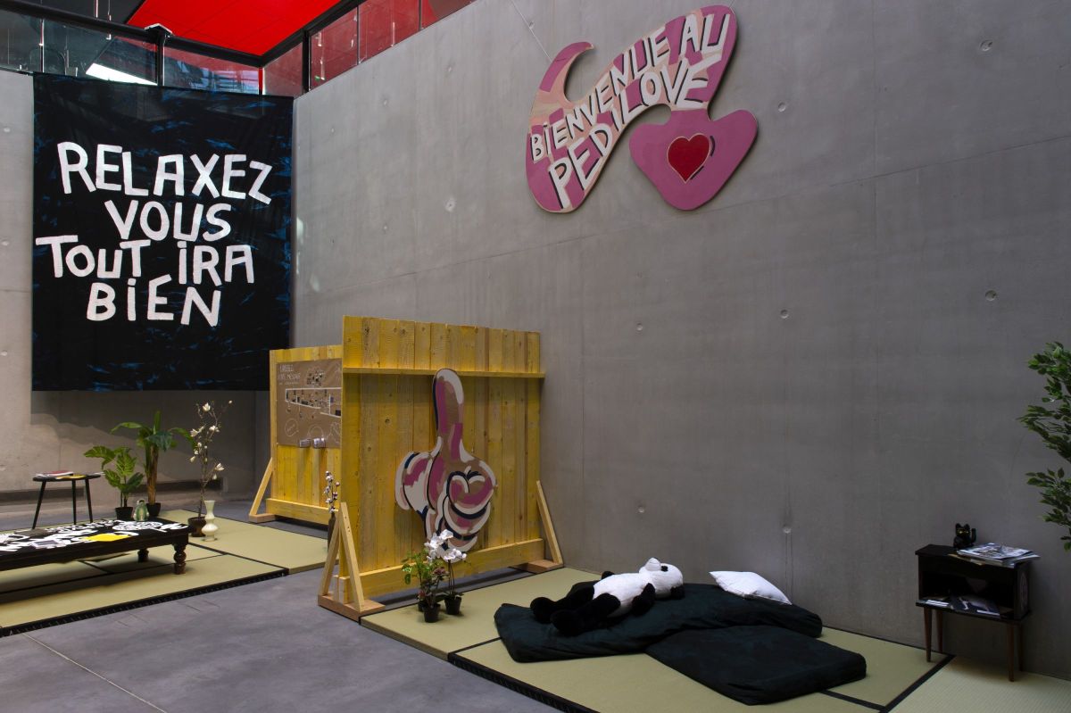 Cette installation d’Anaïs Touchot, située dans le Canyon du Frac Bretagne, est maintenant le lieu où le public est invité à chiller, lire, écouter, griffonner, se cacher, discuter… au milieu des barricades/palissades et des tatamis et avec la complicité du service des publics du Frac, qui a imaginé des dispositifs interactifs pour l’occasion. Le Pédilove propose un espace de flânerie, incite les corps à adopter une attitude un peu molle, d’attente, de lascivité. Des paroles peintes sur des tissus, des tables, des pancartes, jouent avec des expressions tirées de tutoriels d’hypnose, de méditation, de coaching et ajoutent une strate « fortune cookies » (biscuit chinois) à cet environnement artificiel.