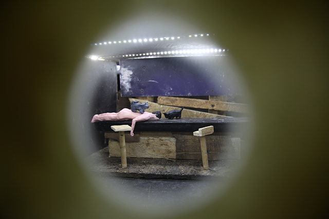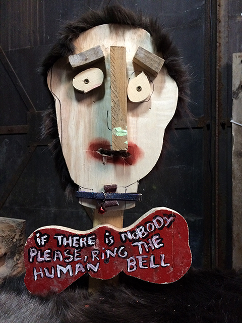 Bois de récupération, branches, briques, céramique, clochette, croquettes, fourrure, journaux, pâte auto-durcissante, plâtre, pastels, porte, led