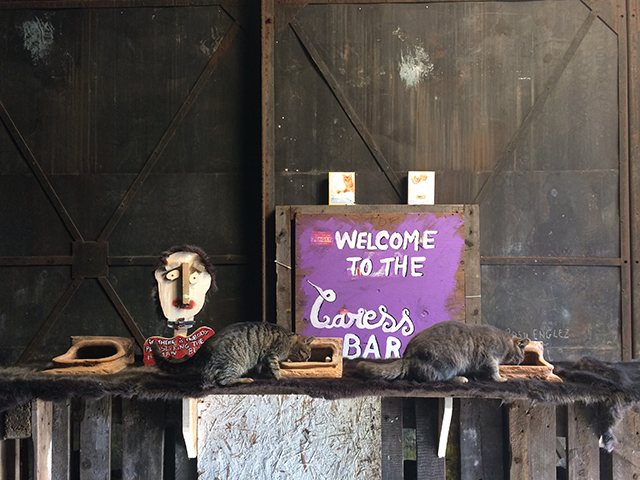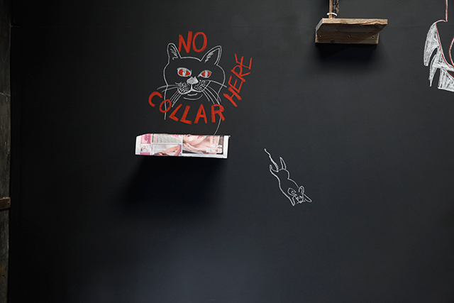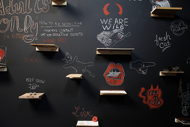 Inside the Chocolat space, you will find a seductive Caress Bar in which cats and humans engage in a mix-and-match role play of waiters and customers, providing mutual services. Beware though, this is not your regular cuteness-overloaded cat-café! Its slightly gloomy, cheap and suburban feeling make it all the more appealing to both humans and felines. So wait your turn and enjoy the enigmatic fluffiness !