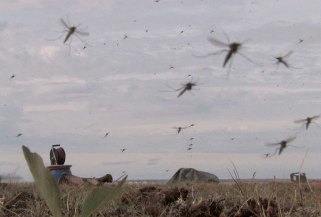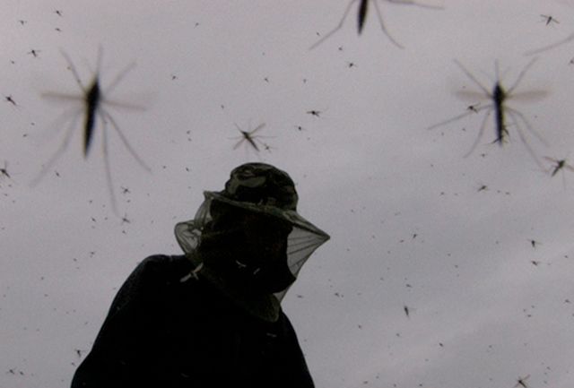 Au milieu d’une nature plate, un campement. L’air est tapissé de moustiques. Le visage carapaçonné derrière des filets verts, les humains travaillent à leur survie mais tentent d’autres activités : un indien débite de la viande fraîche, des types manipulent des ossements, il y a des enfants, un feu, un chien. Toujours les moustiques sont là, veilleurs avides, en multitude.