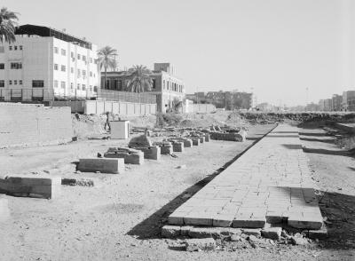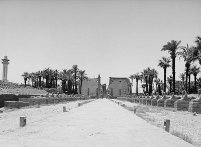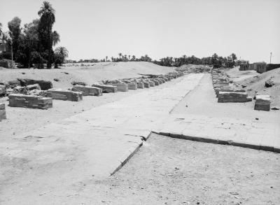 Telle qu’elle surgit aujourd’hui des travaux archéologiques entrepris depuis 2005 par le Conseil Suprême des Antiquités, l’allée processionnelle de sphinx qui reliait le temple de Karnak et celui de Louqsor est une œuvre du pharaon Nectanébo Ier (XXXe dynastie, 4e siècle av. J.C.). De part d’autre de cette allée, furent disposés, à intervalles réguliers, des sphinx représentant le roi sous la forme d’un être hybride à tête humaine et corps de lion. Cette allée, clôturée par un mur de brique revêtu d’un parement blanc, au sol dallé, était un lieu de passage lors des grandes fêtes qui rythmaient le calendrier religieux thébain, la plus célèbre étant la fête d’Opet. Les fêtes religieuses de l’Egypte ancienne étaient en effet scandées par des processions au cours desquelles les statues divines étaient portées d’un temple (ou d’une chapelle) à un autre. Bien que les sources soient peu explicites sur le déroulement à proprement parler de ces processions, il semblerait que seuls le roi et le clergé aient été habilités à fouler le sol des allées processionnelles ; le peuple ne pouvait participer qu’en tant que spectateur à la procession et était maintenu à distance par les murs bordant l’allée processionnelle. Au cours de la fête d’Opet, instituée selon toute vraisemblance au cours du Nouvel Empire (de 1550 à 1069 av. J.-C. env.) et qui s’étendait sur plusieurs semaines, les statues des dieux Amon, Mout et Khonsou, la triade thébaine honorée dans le temple de Karnak, étaient portées en procession jusqu’au temple de Louqsor. Elles y faisaient alors l’objet de rites spécifiques dont la nature exacte ne nous est pas connue, avant de reprendre le chemin du temple de Karnak.