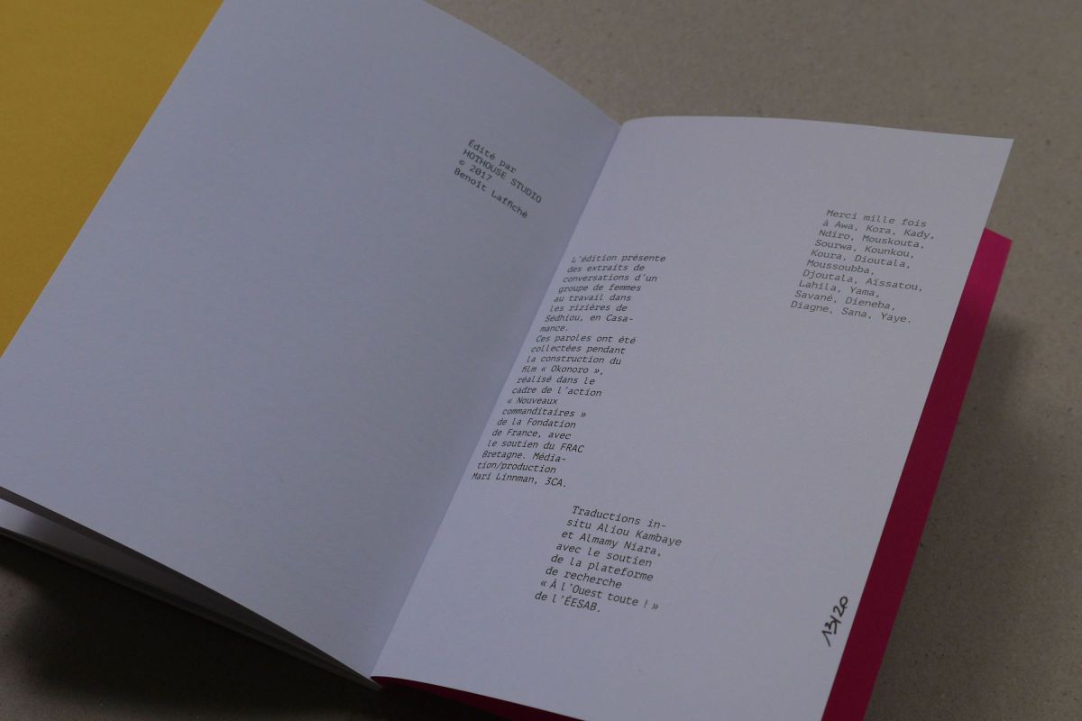 L’exposition La saison sèche présente des éléments réalisés et rassemblés par Benoît Laffiché en lien avec une commande qui lui a été confiée. Il s’agit d’un film, d’un livre, d’une photographie, d’une affiche et de documents d’archives, tous liés à un travail mené en Casamance, au Sénégal, entre 2013 et 2016. En 2013, des membres de l’association francilienne Diaspora Casamance ont saisi l’action Nouveaux commanditaires 1 afin de commander une œuvre à même de raconter leur région si particulière par sa position géographique enclavée, sa proximité culturelle avec la Gambie et la Guinée Bissau et enlisé dans un contexte de conflit armé qui sévit depuis 1982 entre rebelles et pouvoir. Le film Okonoro, réalisé par Benoît Laffiché en réponse à cette commande, a été tourné dans trois lieux : une rizière, le fleuve Casamance et le village diola Djiguinoum (où le réalisateur géorgien Otar Iosseliani a tourné en 1978 le film de fiction Et la lumière fut, quelques années avant le début du conflit armé d’indépendance). Okonoro montre des séquences de la vie quotidienne : le travail des femmes dans les rizières, la pêche sur le fleuve Casamance, et un moment exceptionnel organisé par Benoît Laffiché, quand il a projeté Et la lumière fut dans le village de Djiguinoum où le film avait été tourné 40 ans auparavant. Le film Okonoro trace des allers-retours entre la fiction d’Otar Iosseliani et le quotidien des vies, et fabrique une forme cinématographique qui tente de s’approcher de la beauté hésitante de ce territoire.