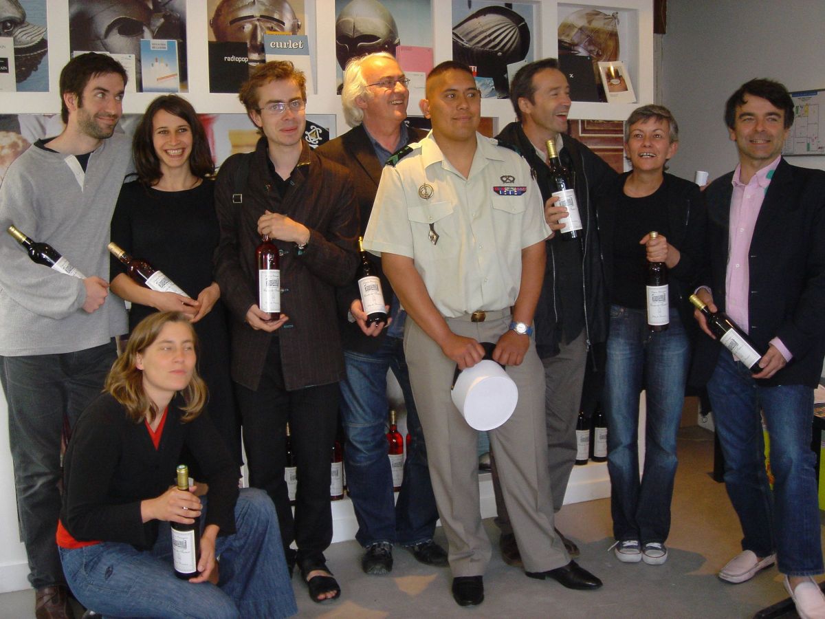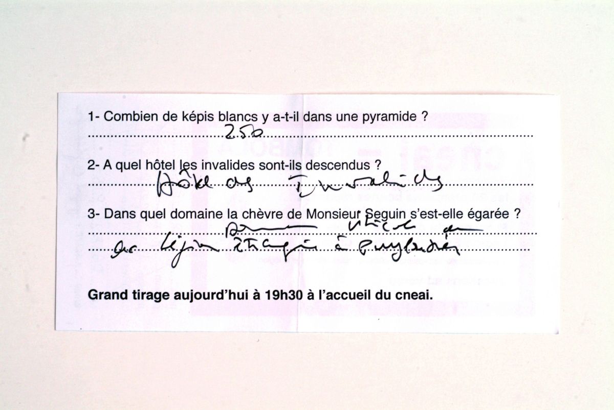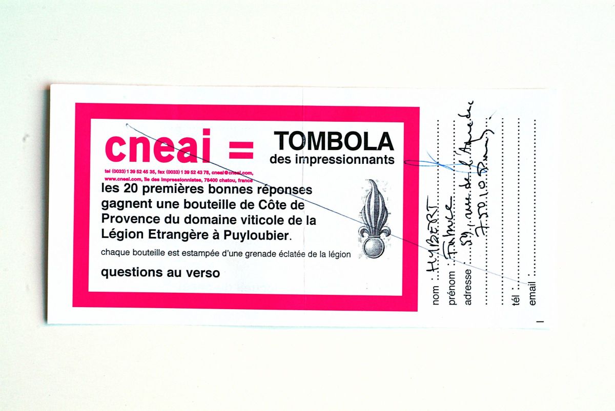 Billets de la tombola des Impressionnants, recto-verso, et les gagnants avec leur lot autour du légionnaire chargé du tirage au sort