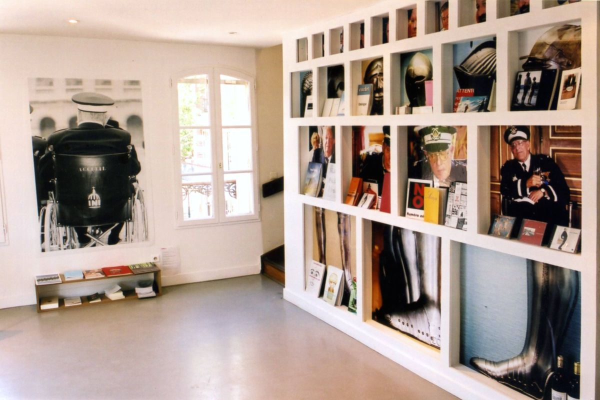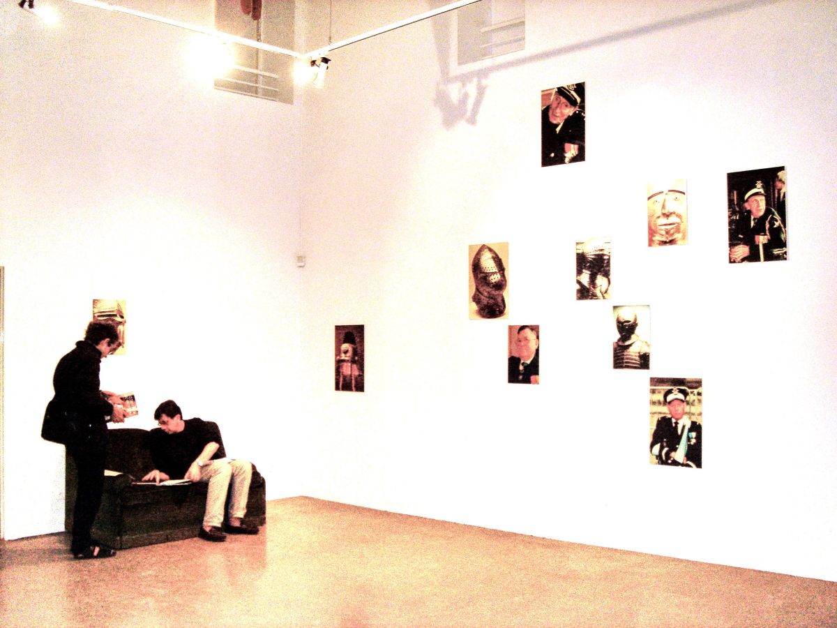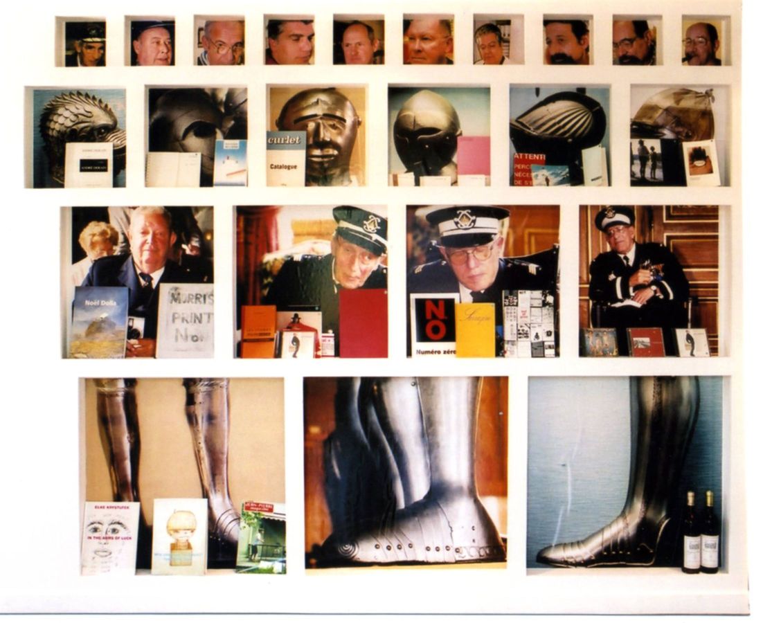 Portrait d’invalide et armets du musée de l’armée, meuble de présentation des éditions du Cneai
