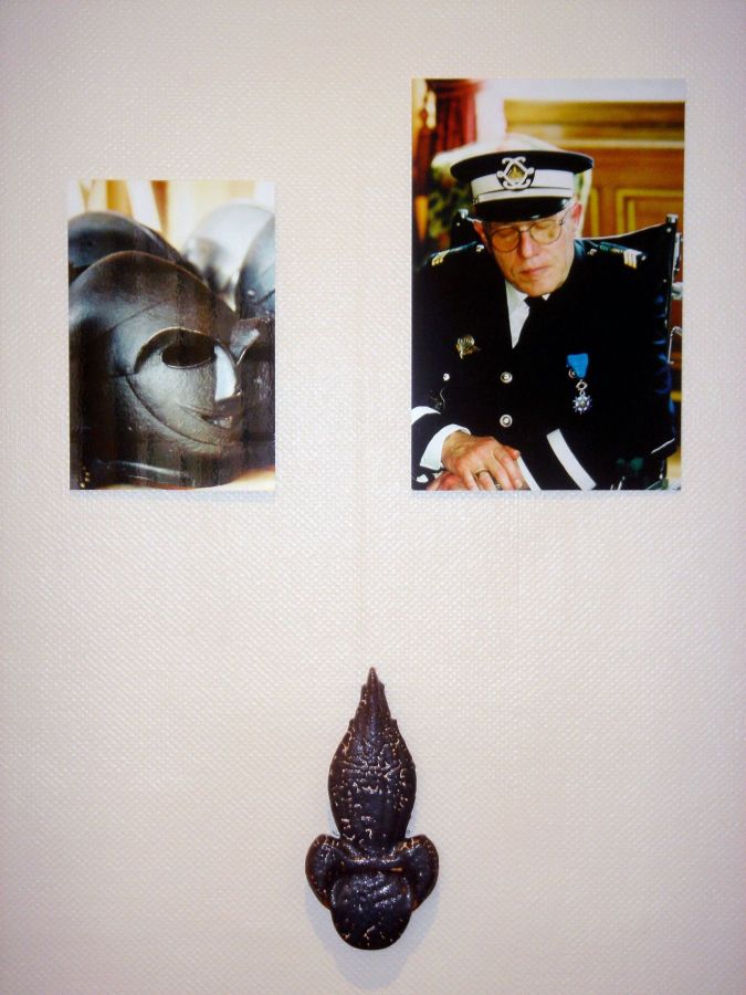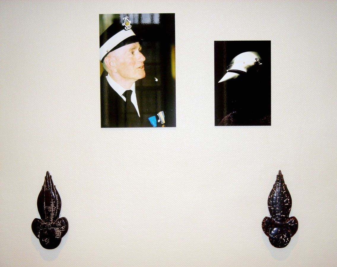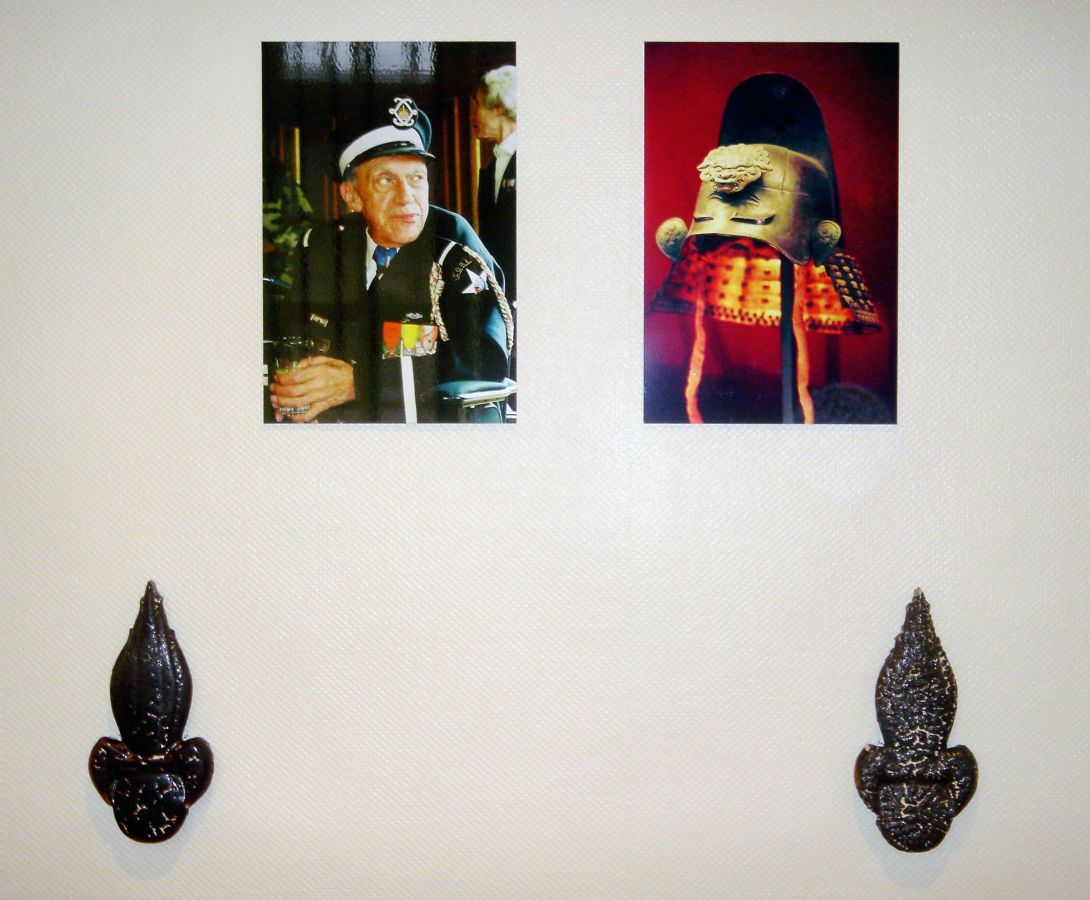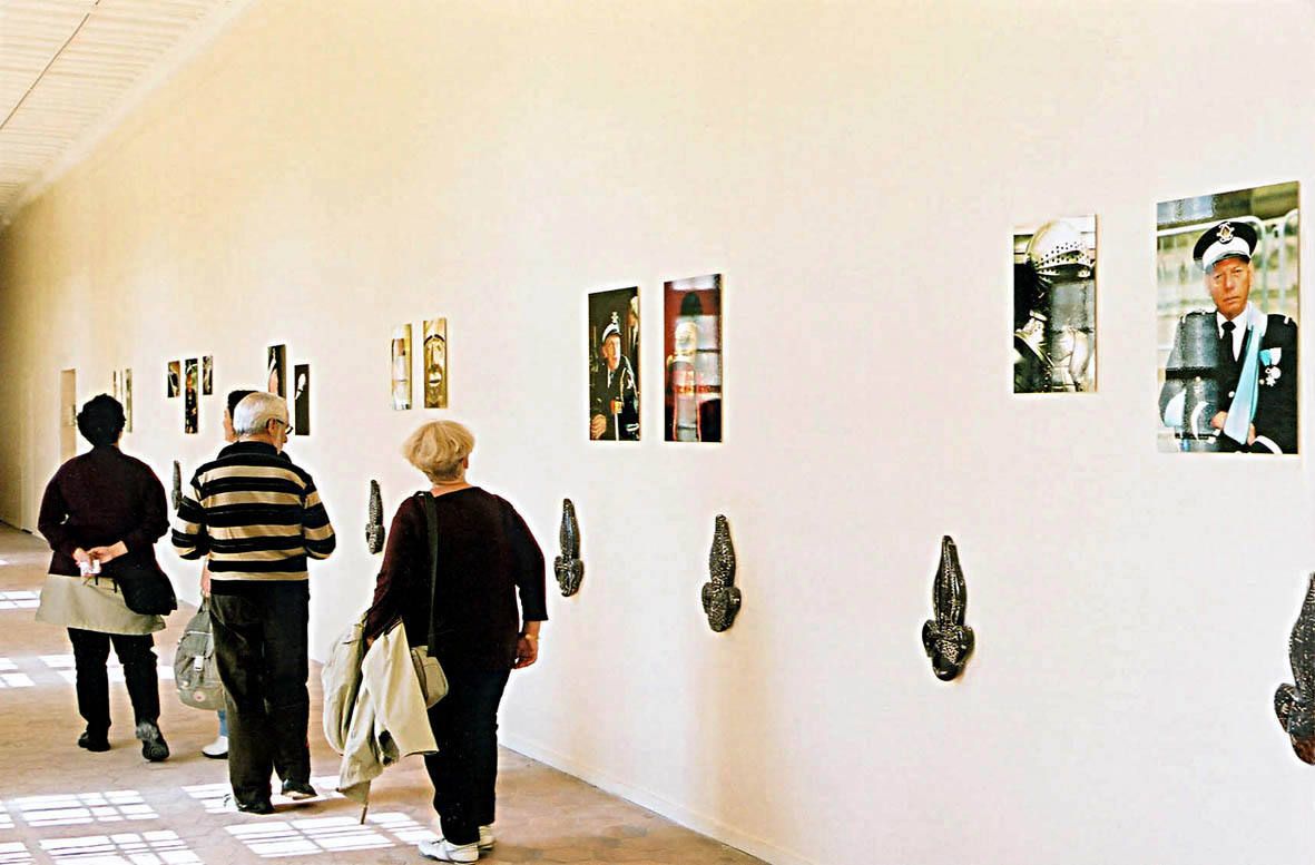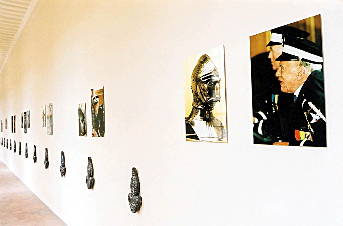 Dialogues, arrangement de portraits d’invalides de l’INI avec des armets de la collection du musée de l’armée et des grenades éclatées en céramique