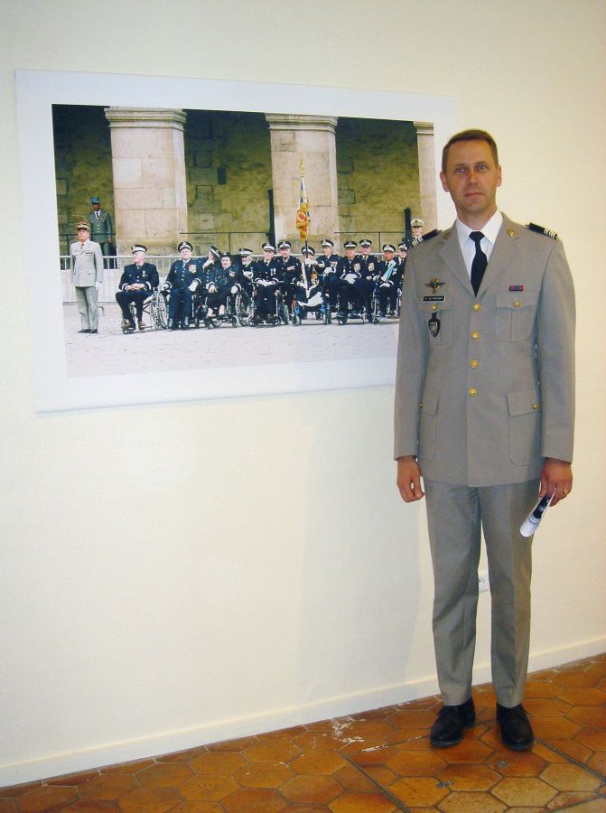 Le Colonel de Fontenay, chef de cabinet du Général Hervé Gobillard, Gouverneur des Invalides, devant un tirage sur bâche de la garde d’honneur des Invalides