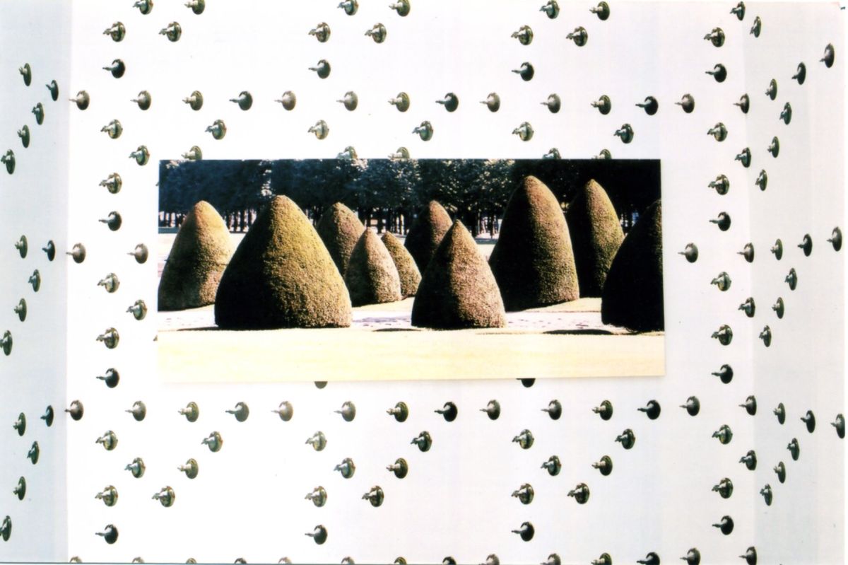 Jardin des Invalides, ifs taillés en forme d’obus sur fond de Vol de migrateurs, éditions du Cneai