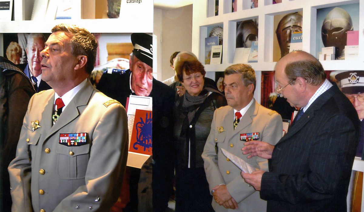 Le Général Gobillard, gouverneur des Invalides et commissaire de l’exposition au Cneai commente les œuvres en même temps qu’il les découvre durant l’inauguration