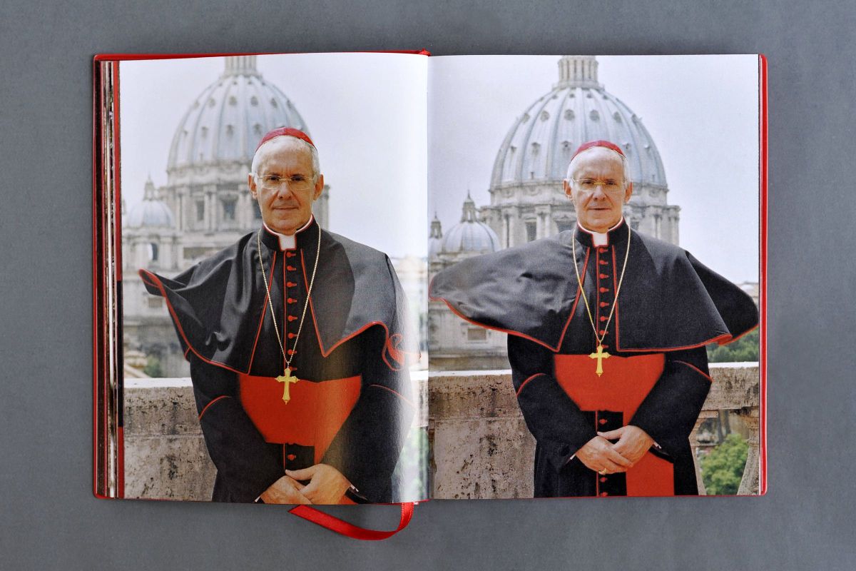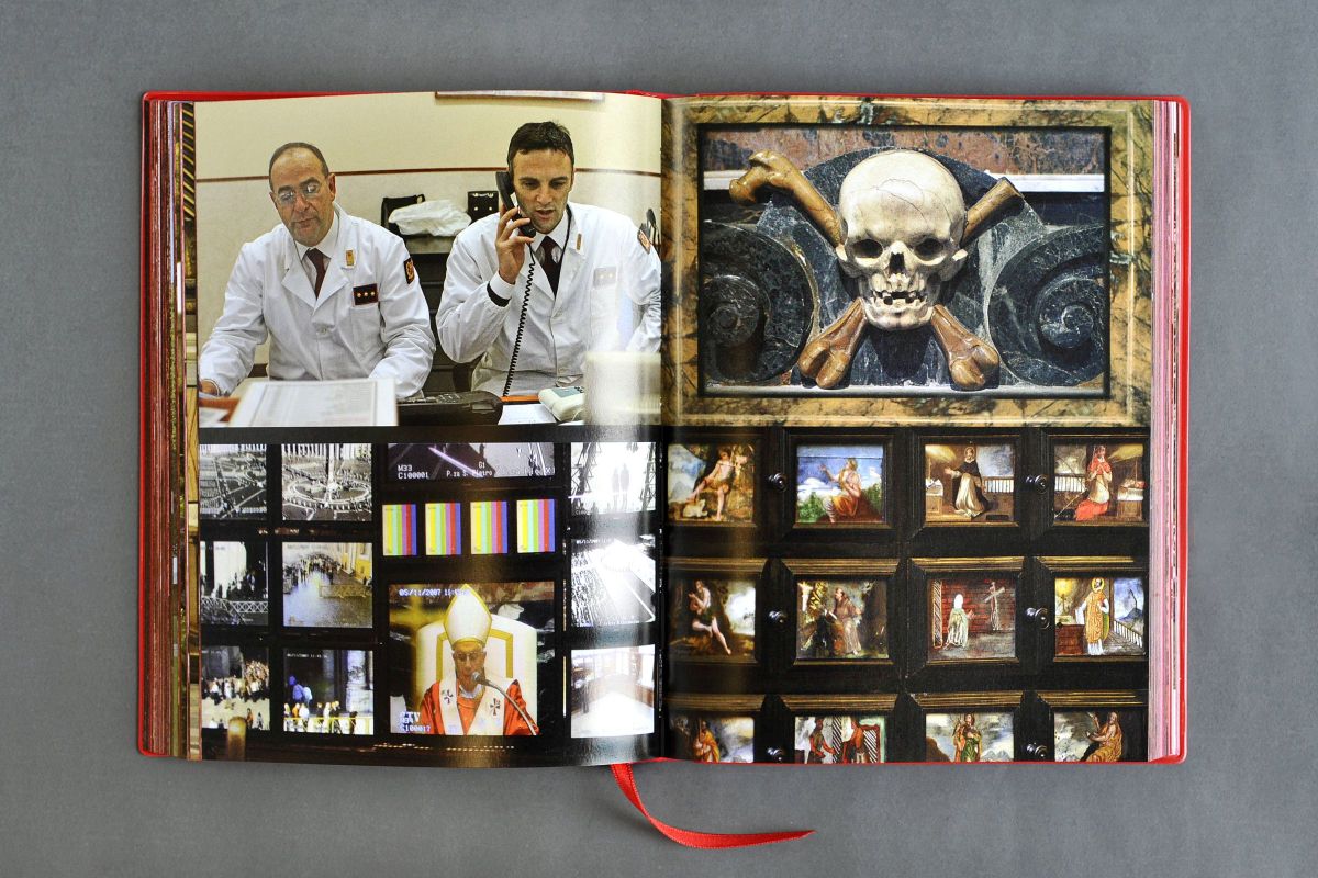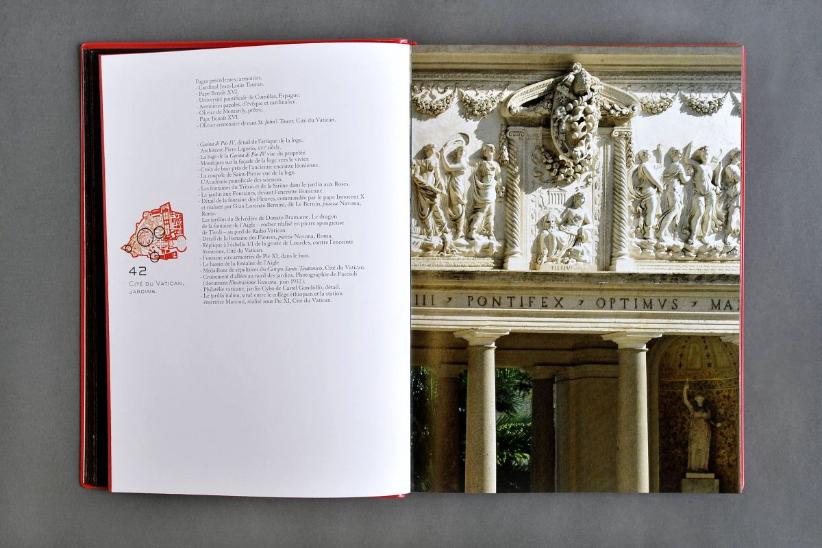 Accompagnés de papamobiles, de vanités ou de gisants insérés en médaillon, douze chapitres légendés en introduction permettent de se situer géographiquement, organisant des vues habituellement inaccessibles au public. De la Casina di Pio IV au Palazzo del tribunale, demeure d’un cardinal, en passant par les jardins de la cité, l’on aboutit à la Bibliothèque Apostolique et aux Archives Secrètes. De Castel Gandolfo où se trouve la Fattoria Pontificie, traversant les jardins, nous retournons à la cité vaticane via les échoppes d’articles religieux situées autour du Panthéon dans Rome.