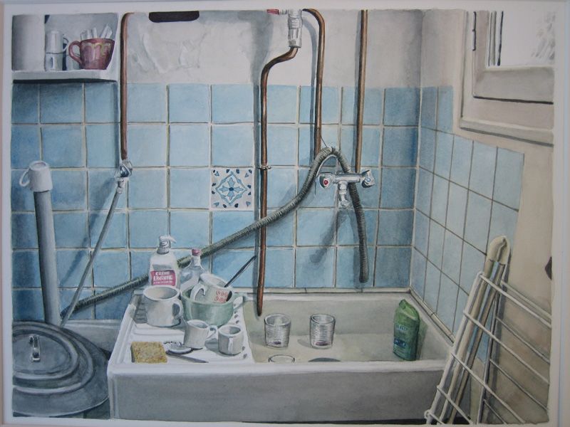 In the first place, Briac Leprêtre’s work strikes with the themes it deals with, that is trivial objects or daily scenes. But the way he produces them outplays this first impression and rephrases his words. Briac Leprêtre sarcastically chooses watercolours, which is usually associated with « pretty » subjects, to represent some flats under construction, kitchen sinks or arm wrestling. This rephrasing is also noticeable in his sculptures, as he makes clothes, backpacks or a tent using concrete, annihilating the function and transforming the object into a relic or remembrance of our time.