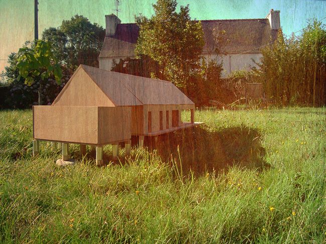 Impression numérique sur un matériau de construction, représentant l’installation-test des maquettes-outil que j’ai utilisées pour la conception de maisons avec les futurs habitants et constructeurs (maison hangar, maison recyclée).