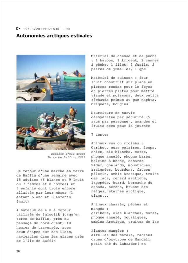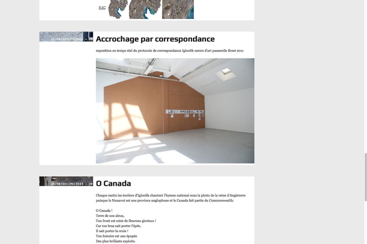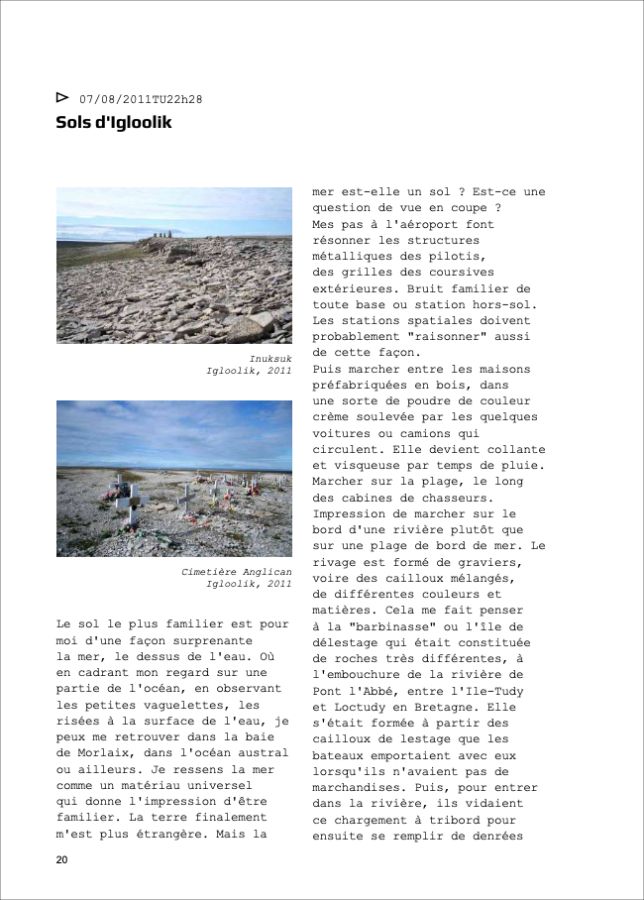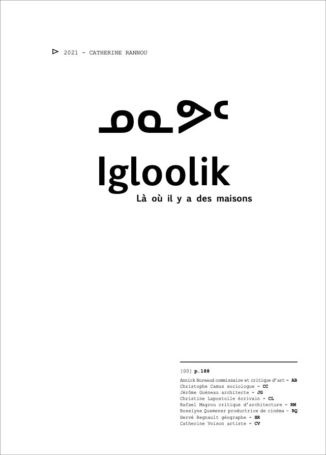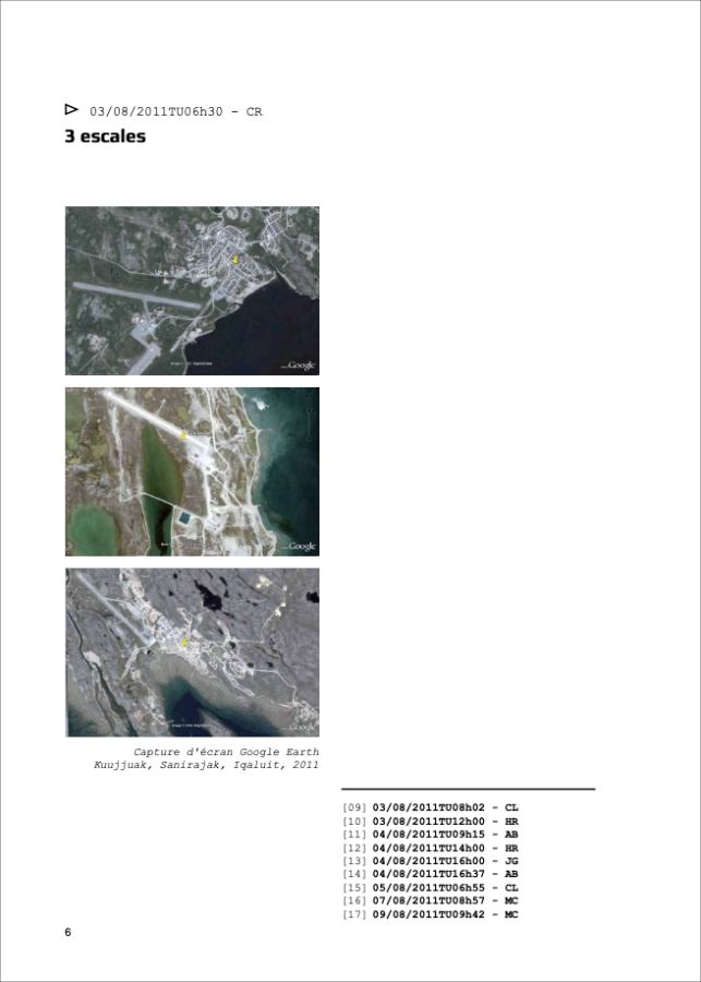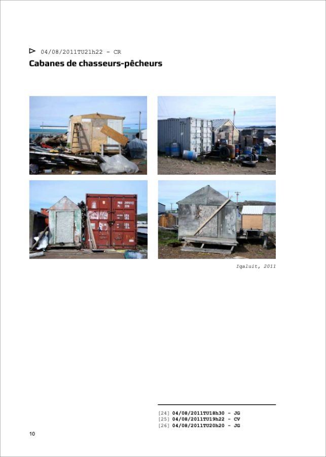 Ces questionnement sont l’occasion d’une correspondance entre Catherine Rannou artiste et huit personnes* qui réagiront sous forme de notes de bas de page, aux textes, images films qui seront adressés régulièrement par l’artiste, pendant ses déplacements et séjours à Igloolik.