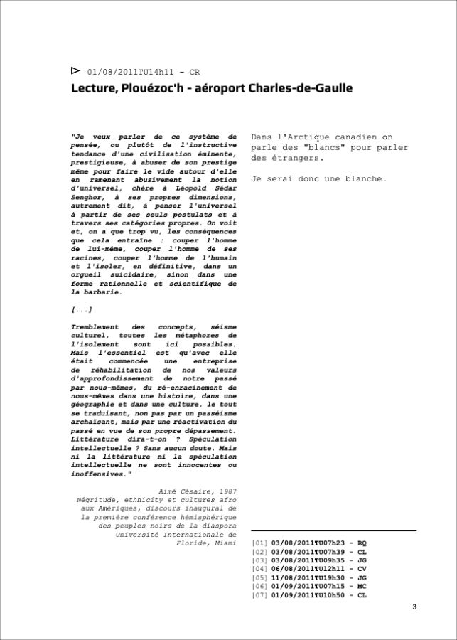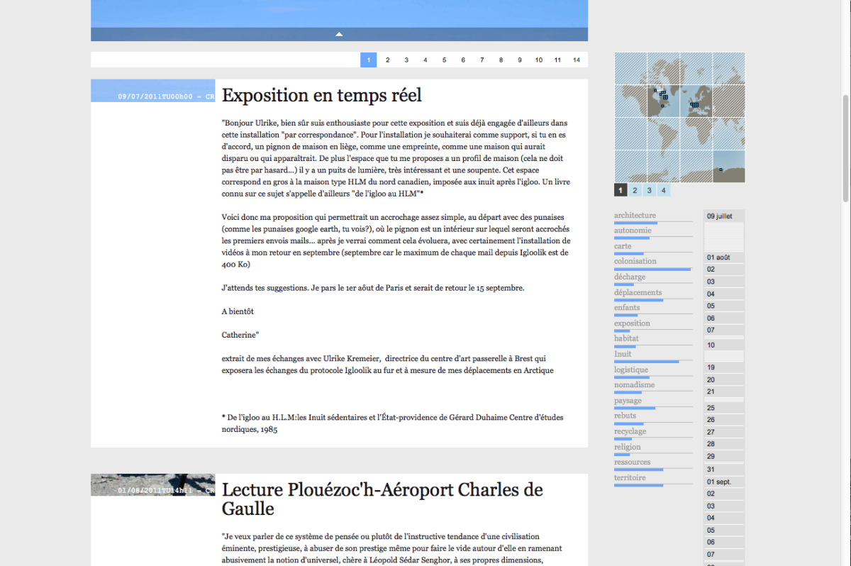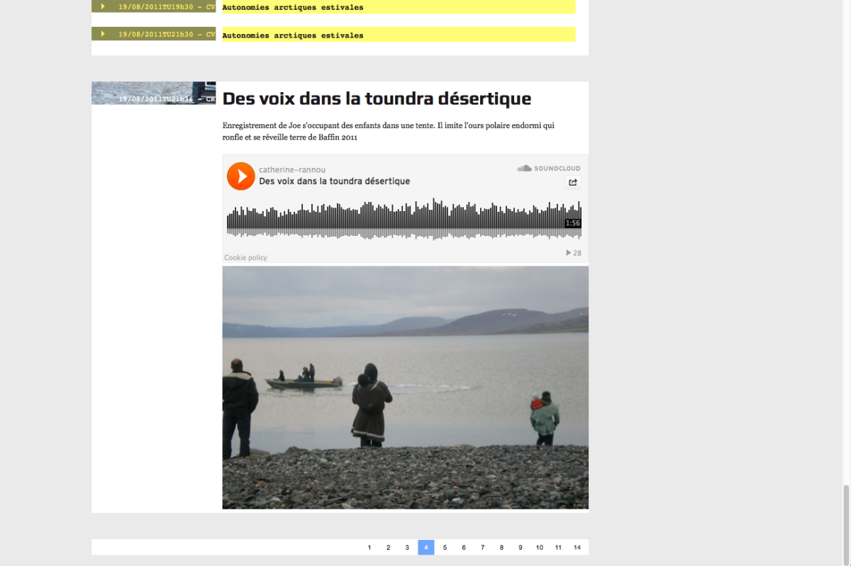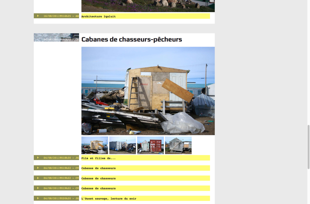 Ces questionnement sont l’occasion d’une correspondance entre Catherine Rannou artiste et huit personnes* qui réagiront sous forme de notes de bas de page, aux textes, images films qui seront adressés régulièrement par l’artiste, pendant ses déplacements et séjours à Igloolik.