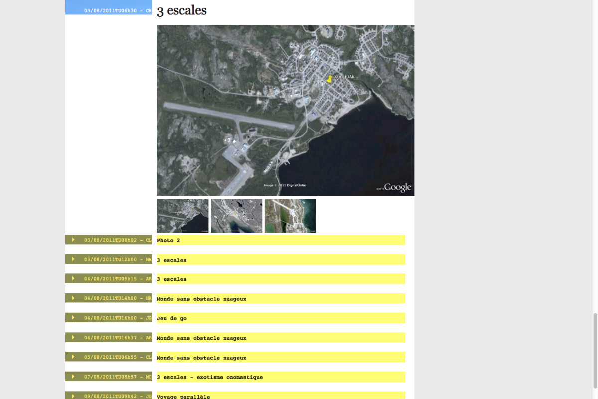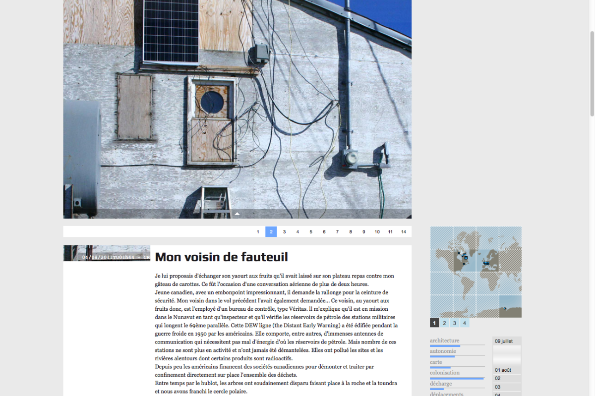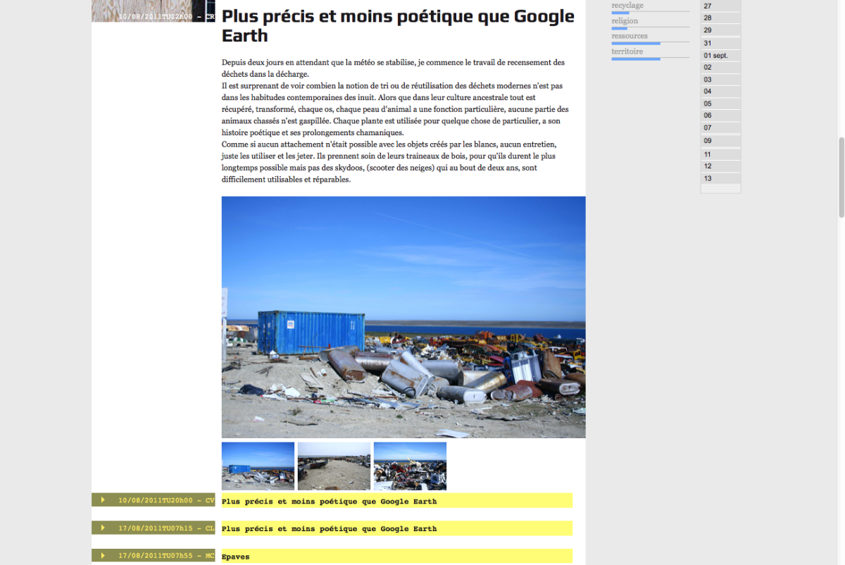 Ce sont des relevés qui mesurent par leur cumul et leur chronologie l’espace parcouru. Les échelles des mesures sont variables, les sujets également. C’est un regard transversal, une vision en “coupe 3D” et en mouvement d’une partie du territoire Arctique.