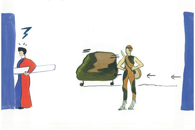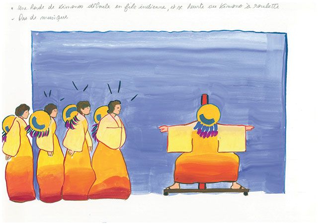 Enchaînement de tableaux vivants éclectiques, joués par des danseurs vêtus de costumes peints, manipulant des décors et des « objets rituels », l’idée de cette pièce est née au cours de mes expériences au Japon et en Australie, des cultures qui m’ont attiré pour leurs rituels performatifs vernaculaires, à la croisée du théâtre Kabuki et de la danse aborigène ainsi que des Matsuri, ces fêtes japonaises annuelles planifiées au rythme des saisons.