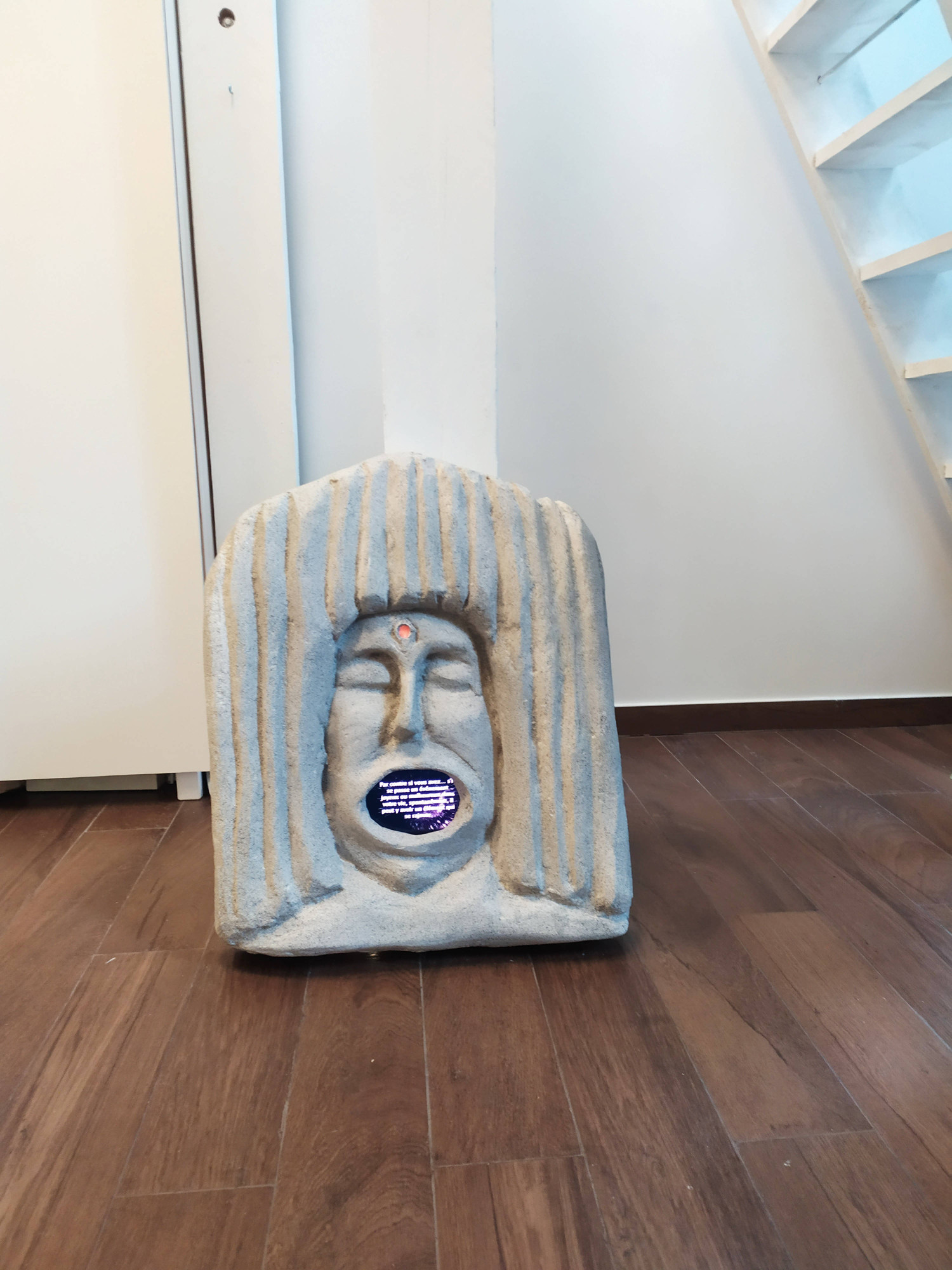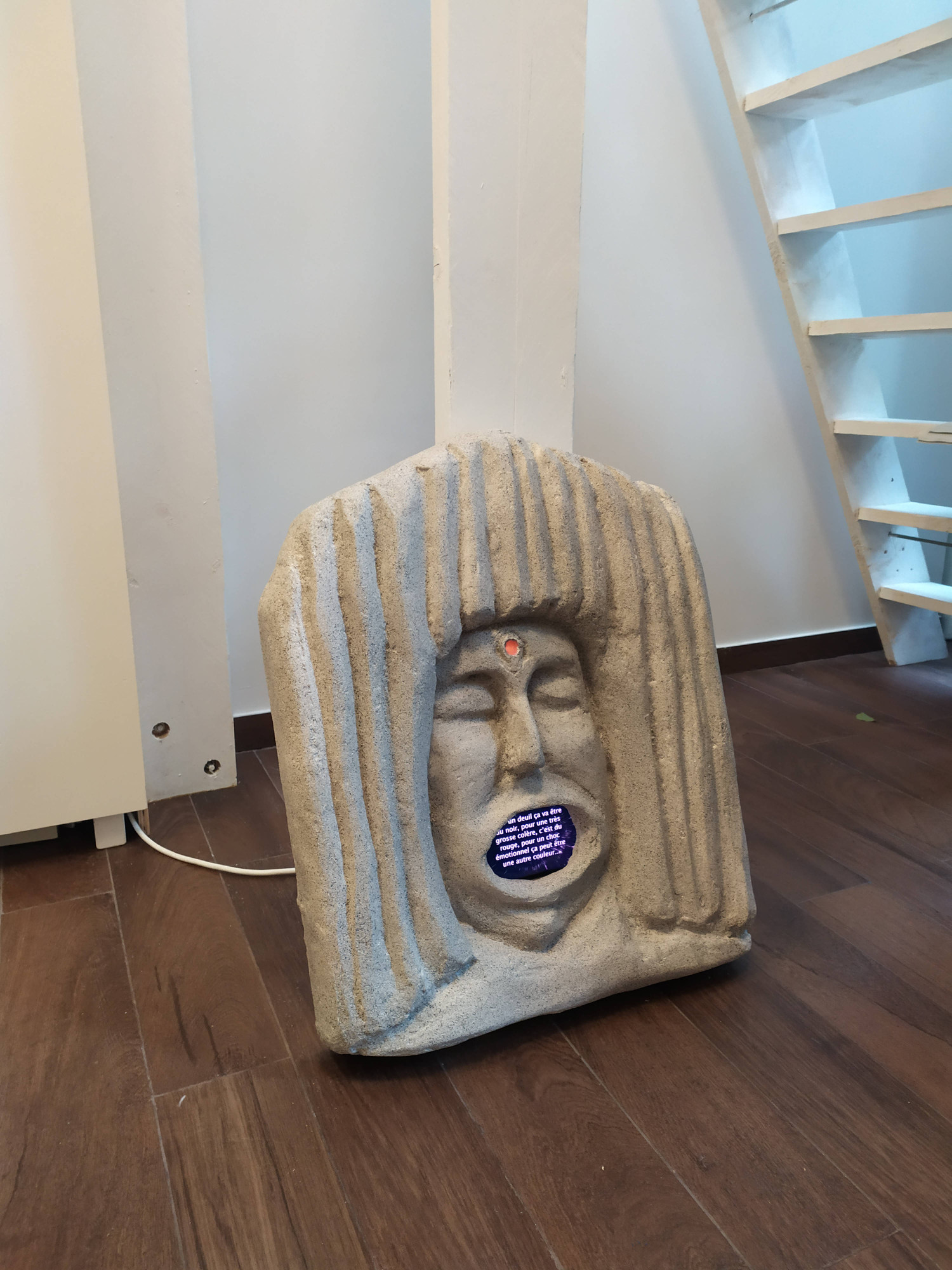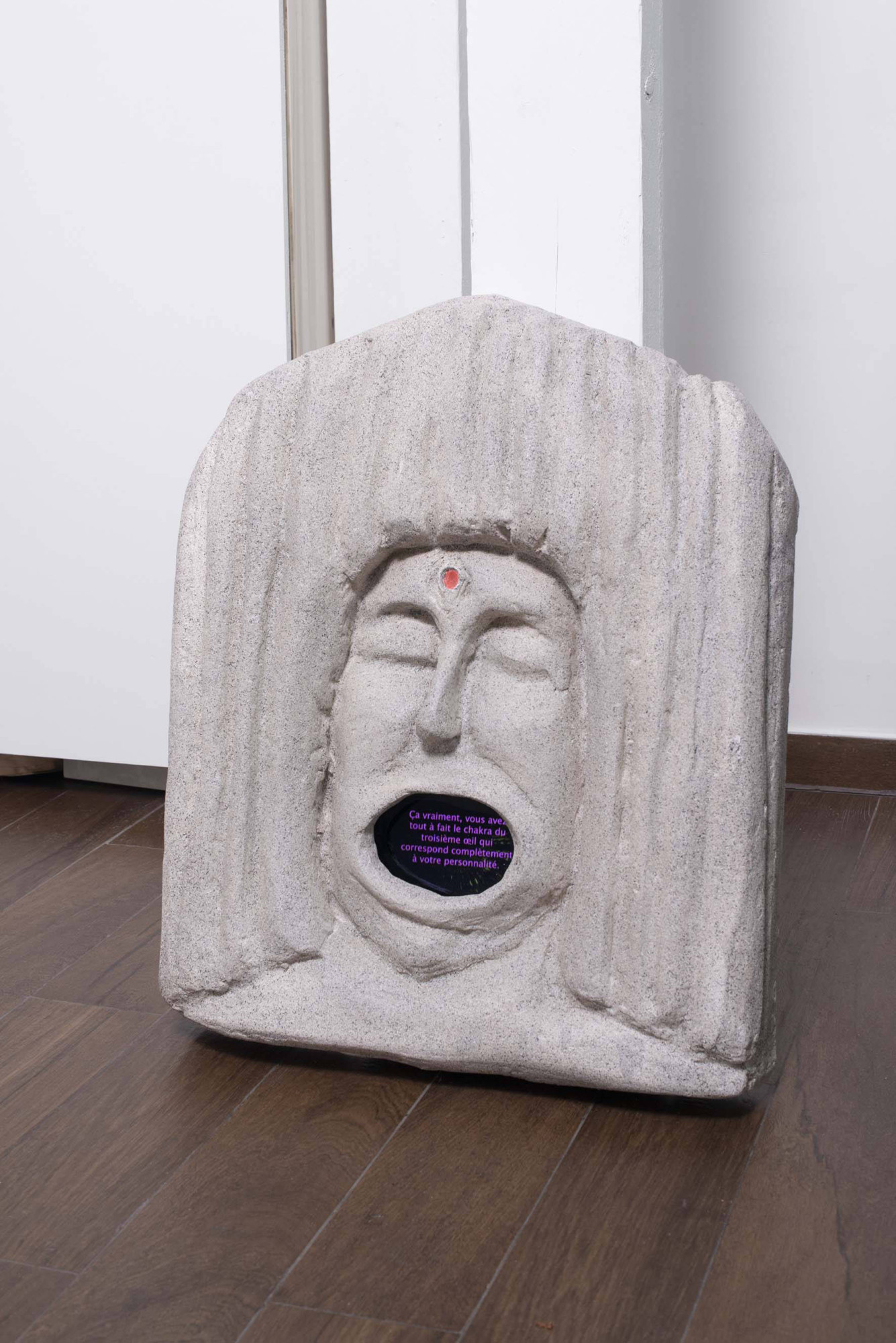 Elle retranscrit la séance et l’intègre à une sculpture représentant une tête de voyante en polystyrène et MAP, imitant la pierre. Cette acrotère faussement antique devient le socle ironique d’un récit où se croisent spiritualité marchande, art divinatoire et capitalisme magique.