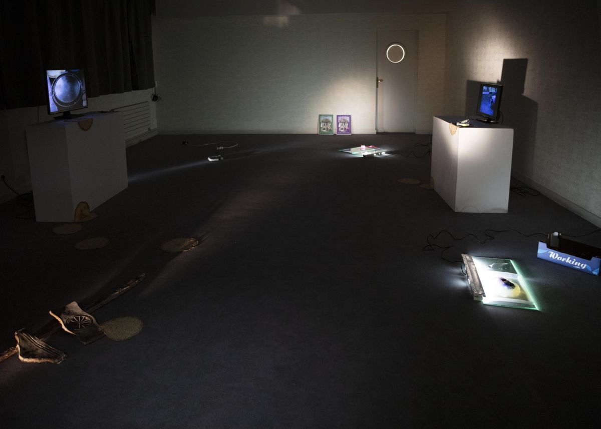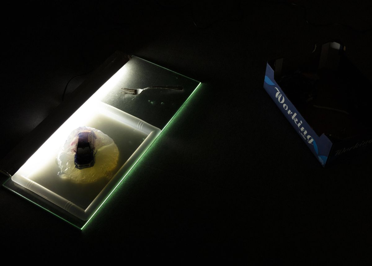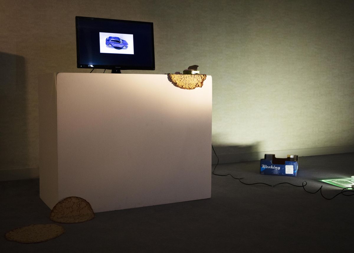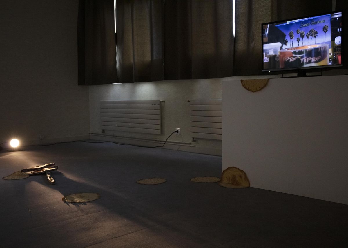 2 boucles vidéo de 40minutes passées en même temps, voiture en gelée, crêpe en latex, boite de sardine, souvenir de vacances. Affiche réalisée par Léo Bret.