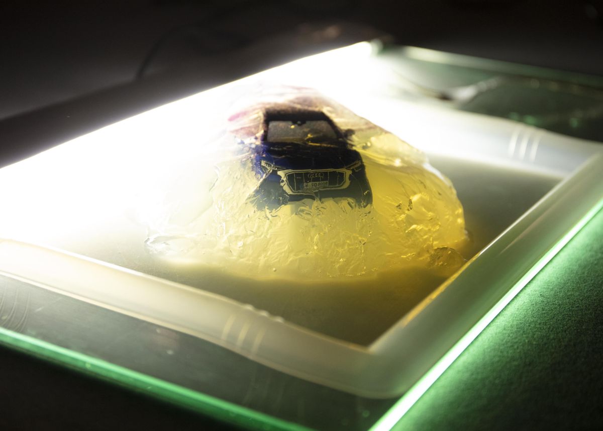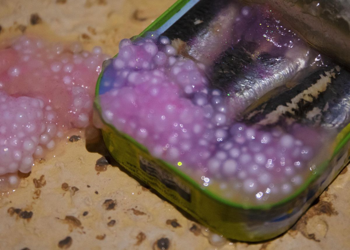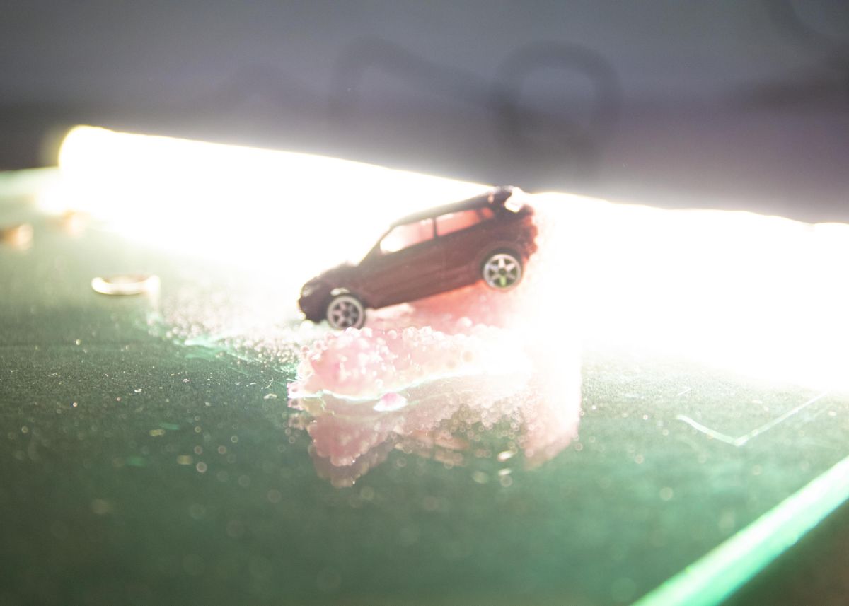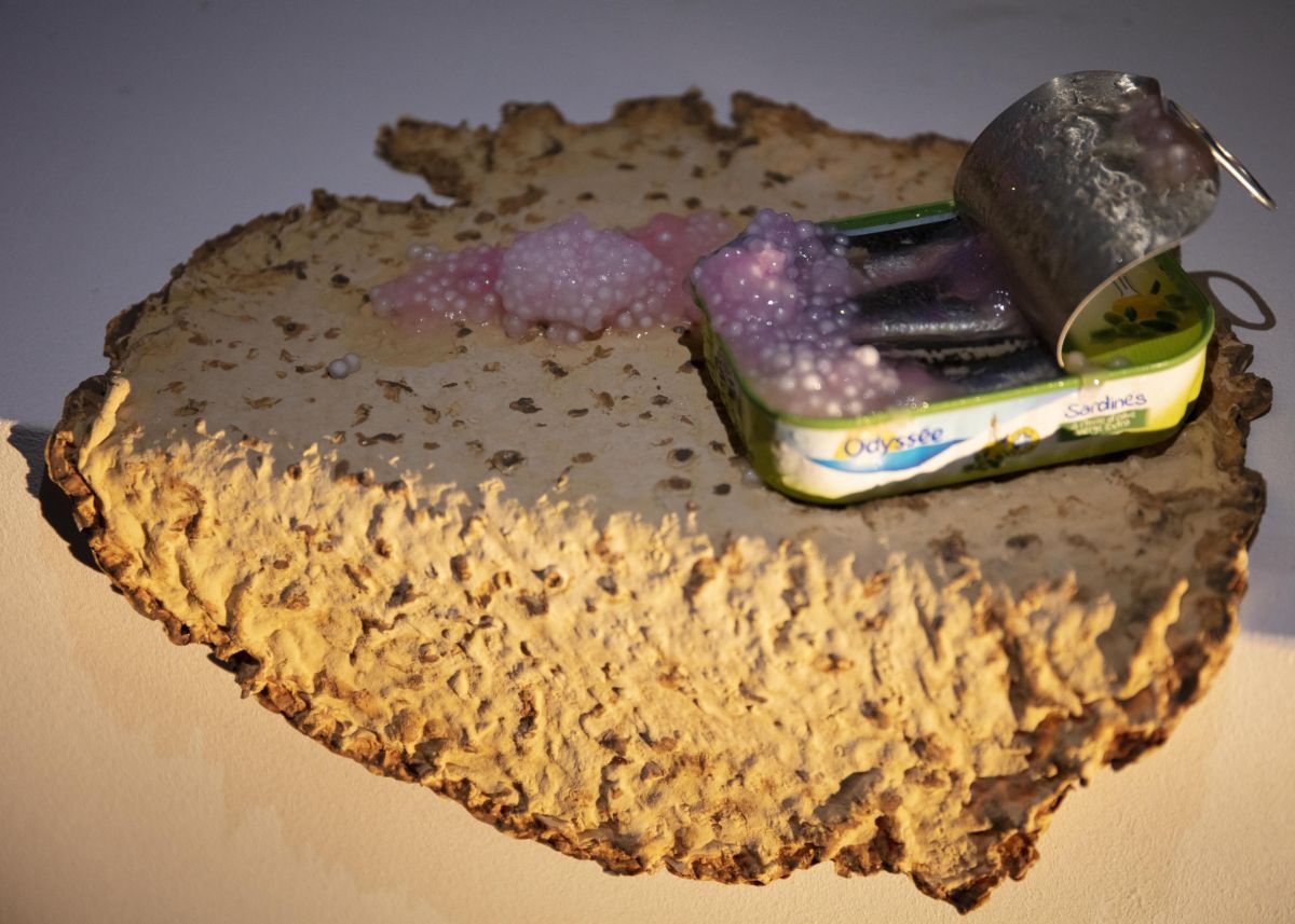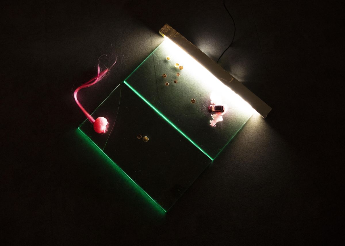 2 boucles vidéo de 40minutes passées en même temps, voiture en gelée, crêpe en latex, boite de sardine, souvenir de vacances. Affiche réalisée par Léo Bret.
