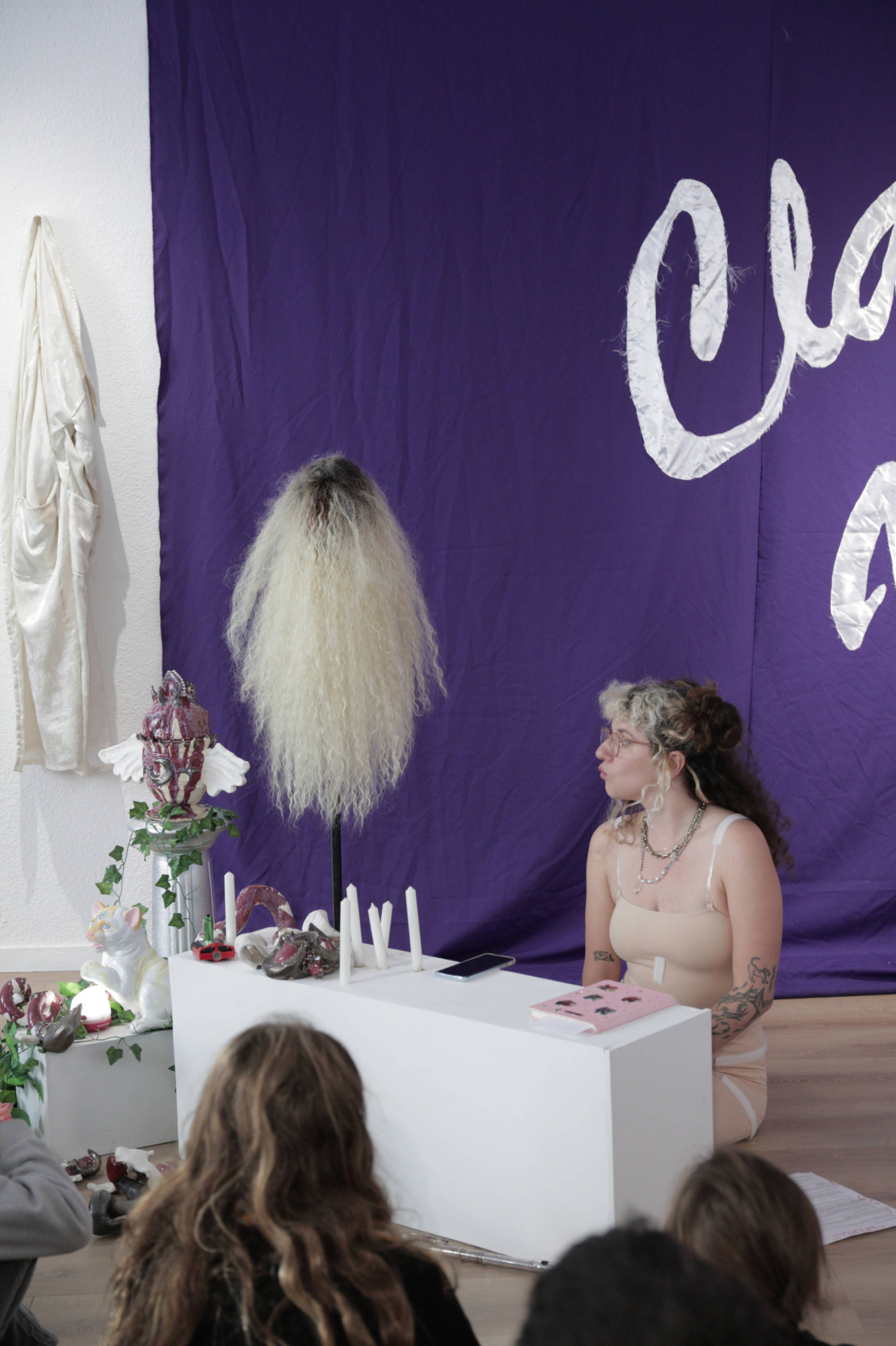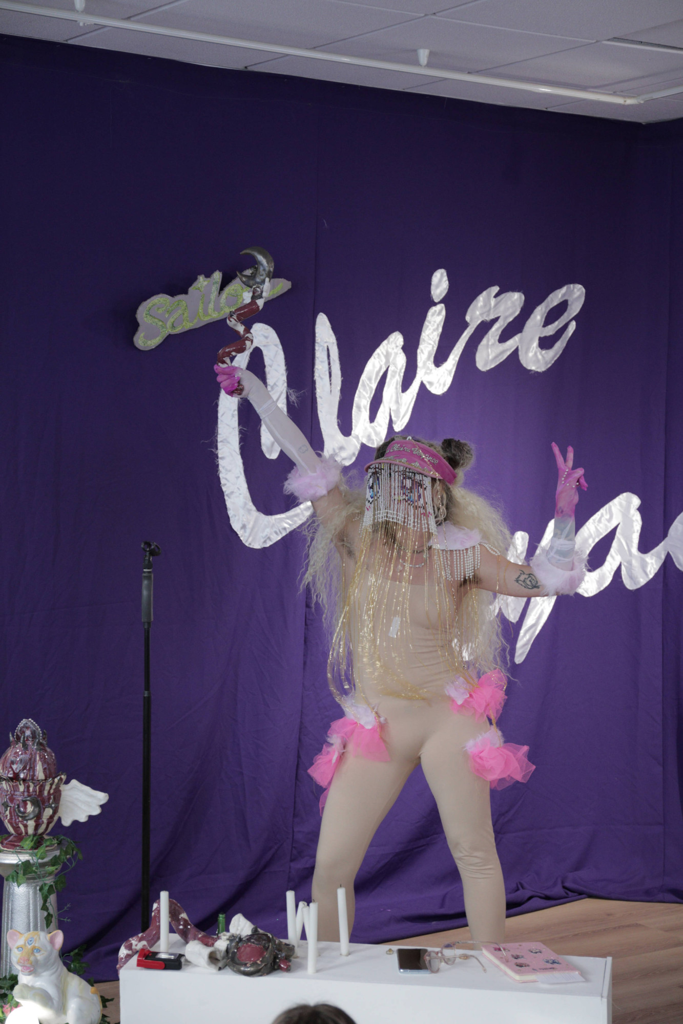 La performance inaugurale Claire Prism Power, Make up! (épisode 0) prend la forme d’une conférence performée d’environ vingt minutes, mêlant narration, musique originale, costumes, céramiques émaillées et accessoires symboliques. Elle y évoque son rapport à la télévision et aux mangas de son enfance avant de laisser place à la transformation : celle de l’artiste en héroïne, et du quotidien en épopée épique.