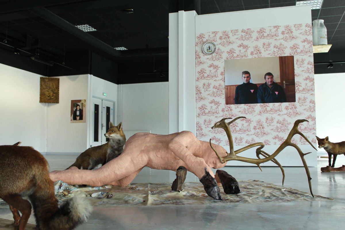 Installation, moulage en plâtre maquillé avec bois de cerf et renards taxidermisés 2m environ