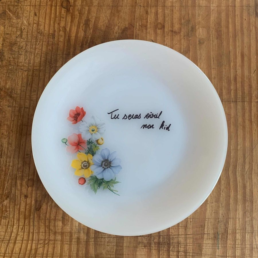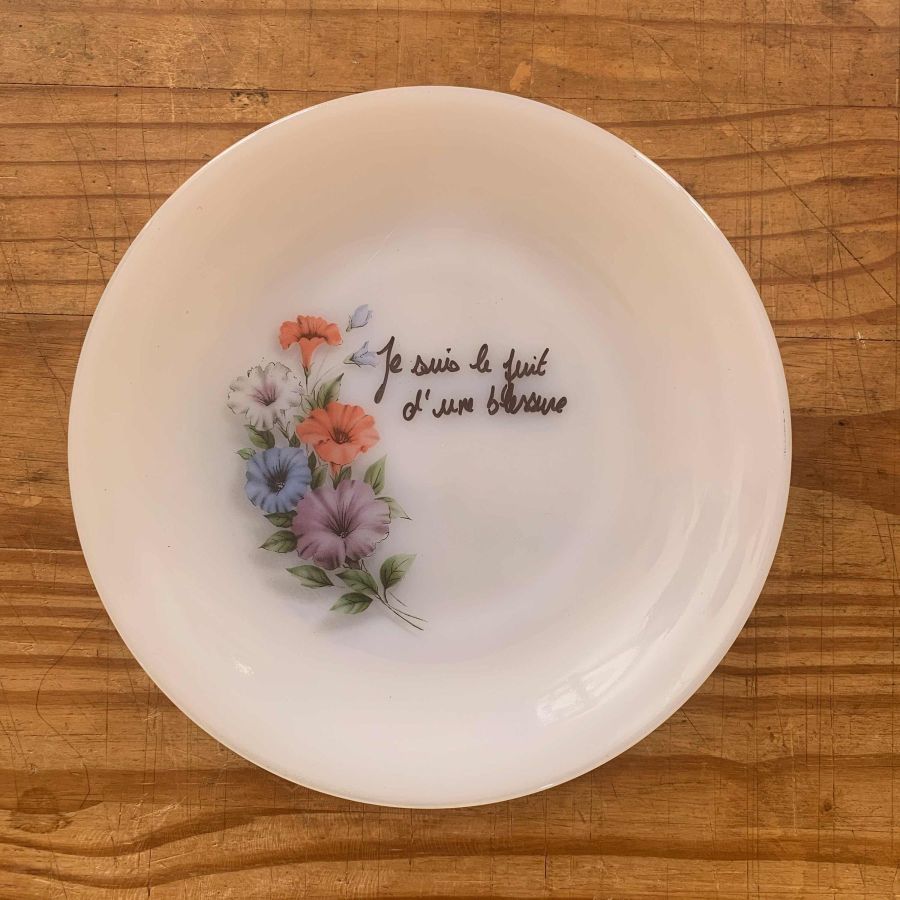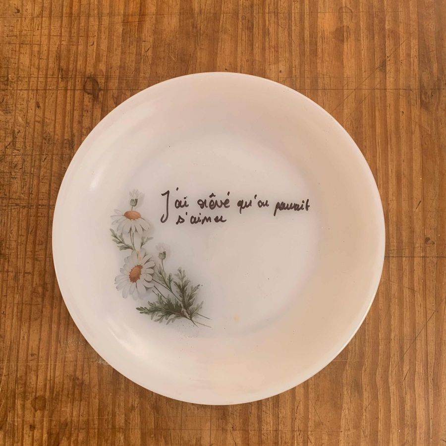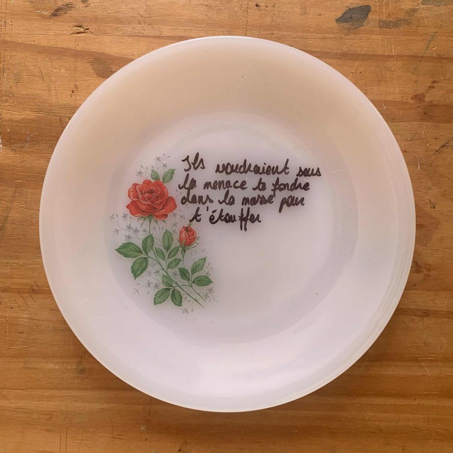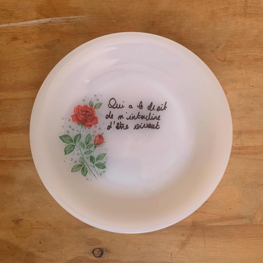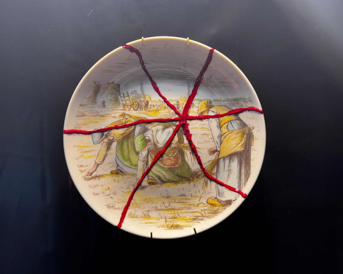 Assiette Glaneuses de Millet brisée et reconstituée avec la technique kintsugi et pigment rouge, issue du projet Passer sa vie aux culs des vaches, 2025