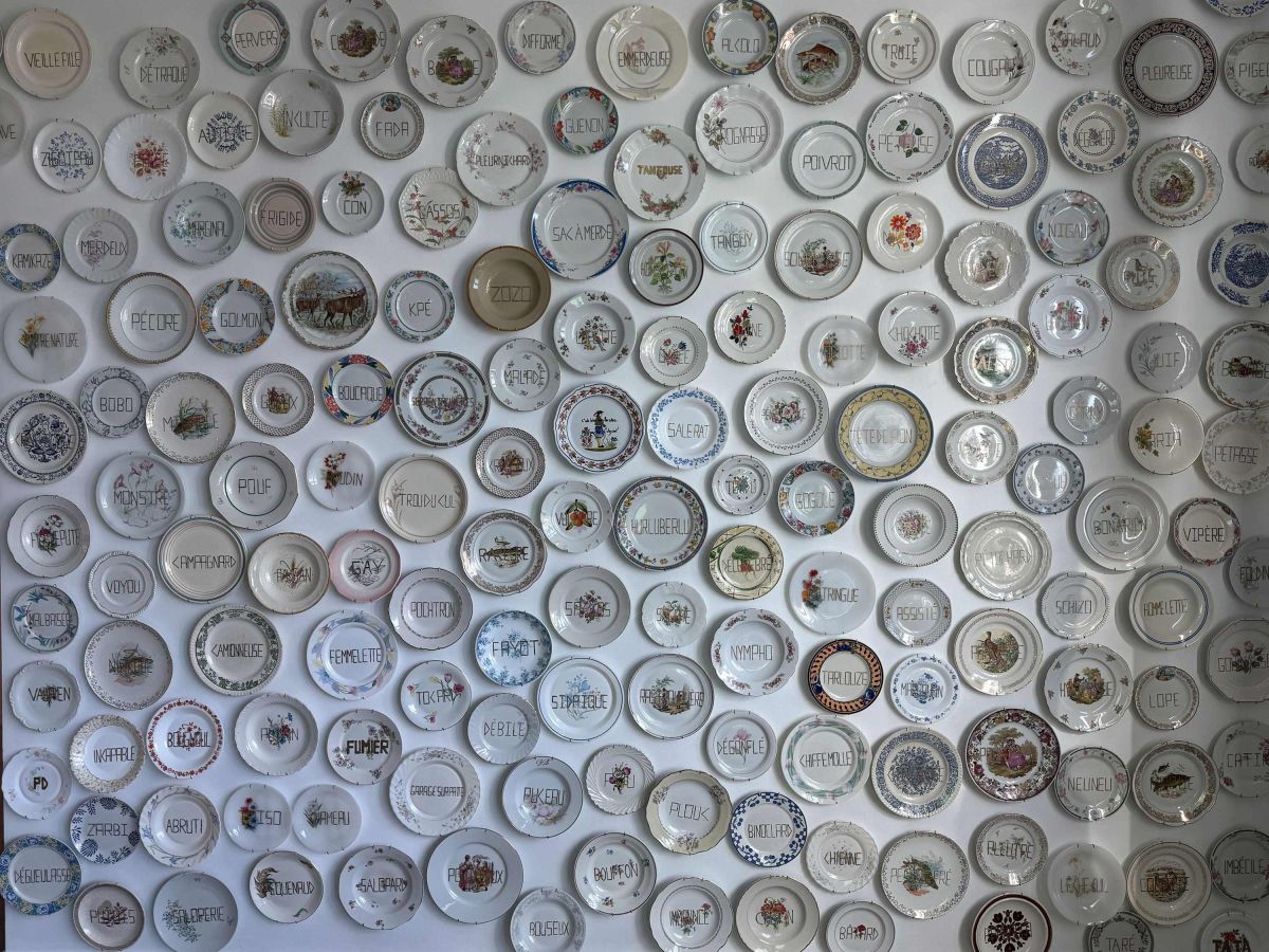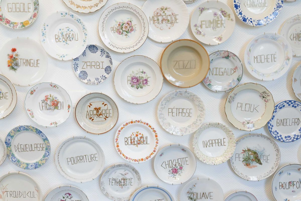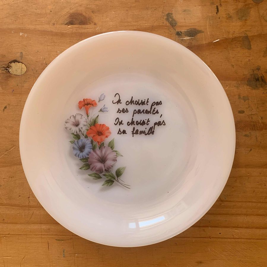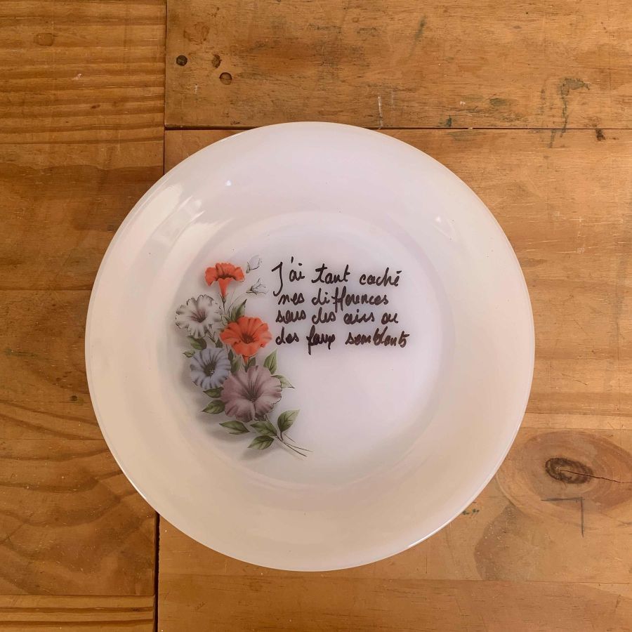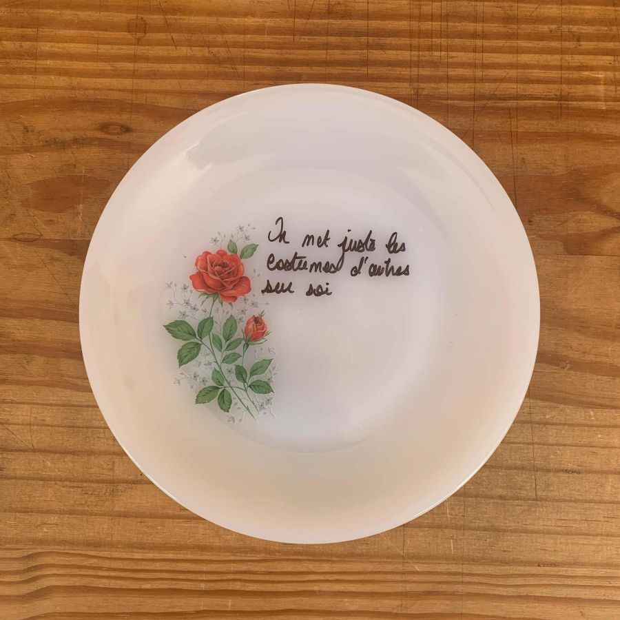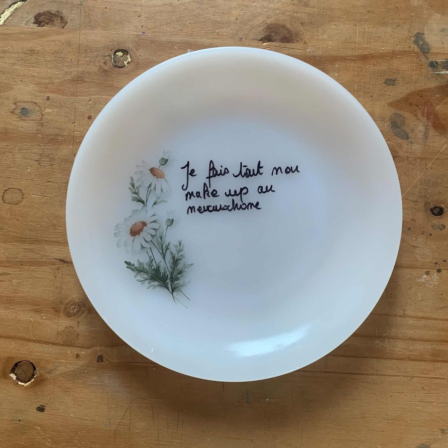 Assiette Glaneuses de Millet brisée et reconstituée avec la technique kintsugi et pigment rouge, issue du projet Passer sa vie aux culs des vaches, 2025