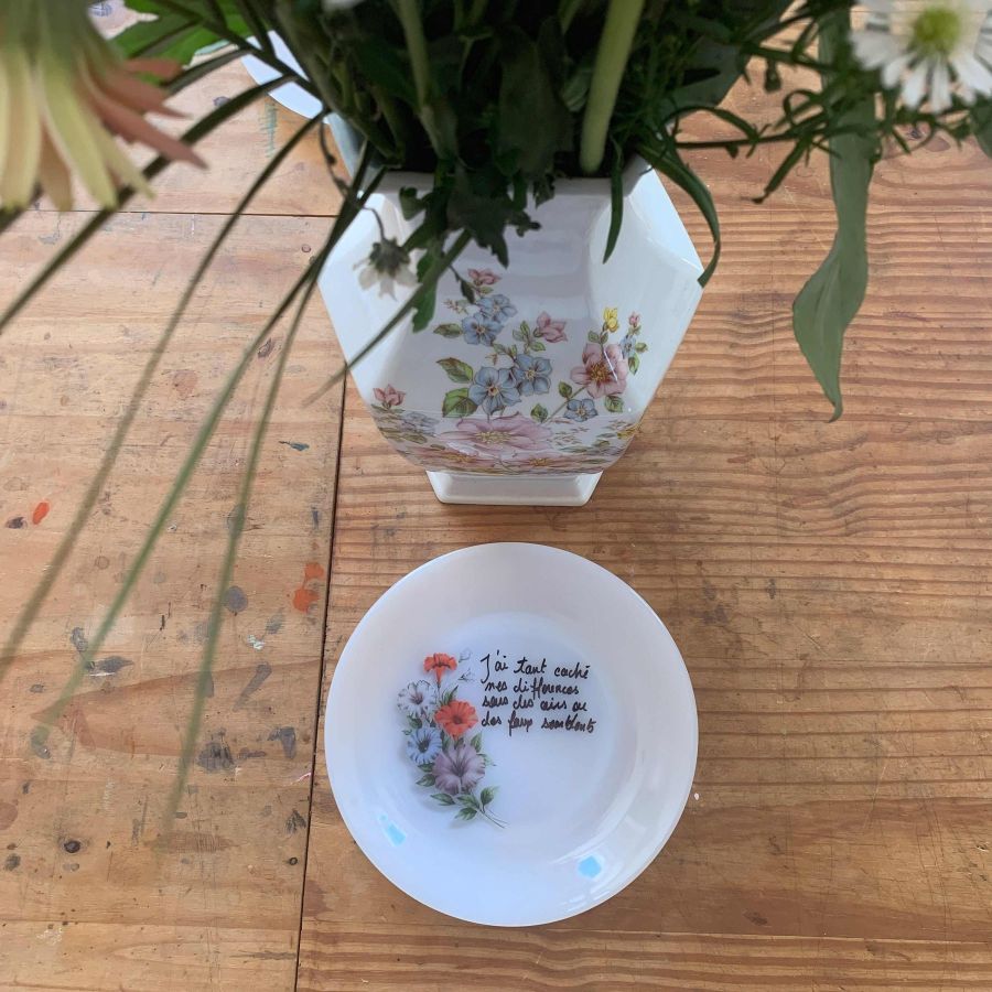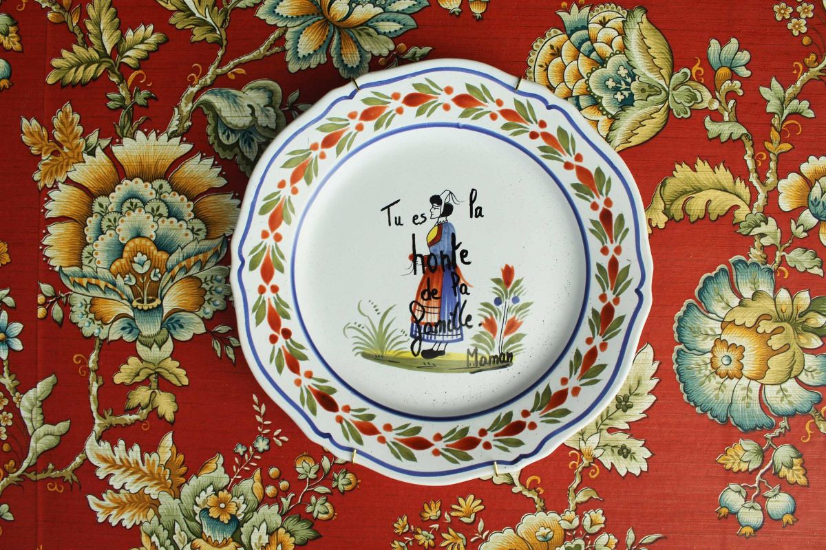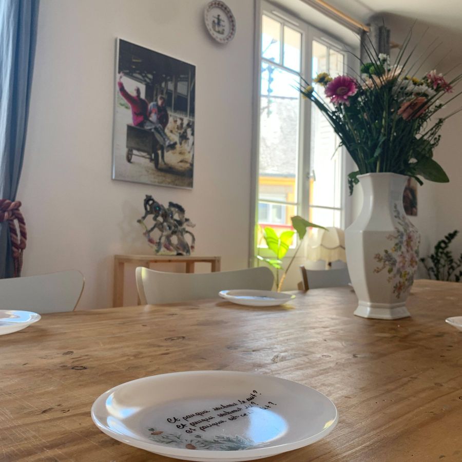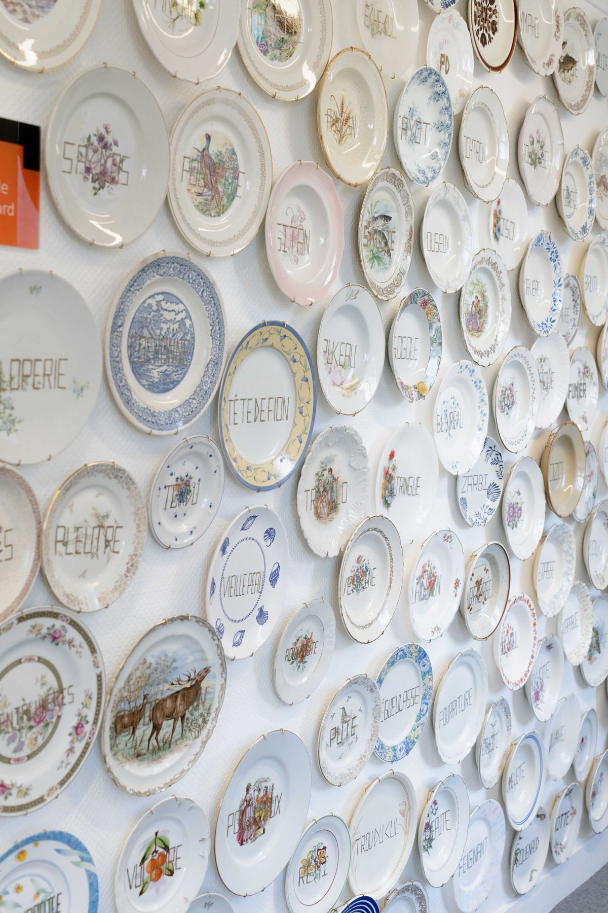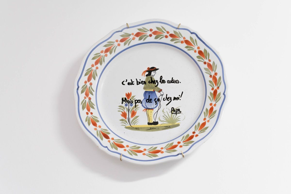 Assiette Glaneuses de Millet brisée et reconstituée avec la technique kintsugi et pigment rouge, issue du projet Passer sa vie aux culs des vaches, 2025