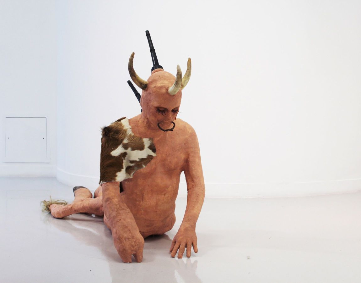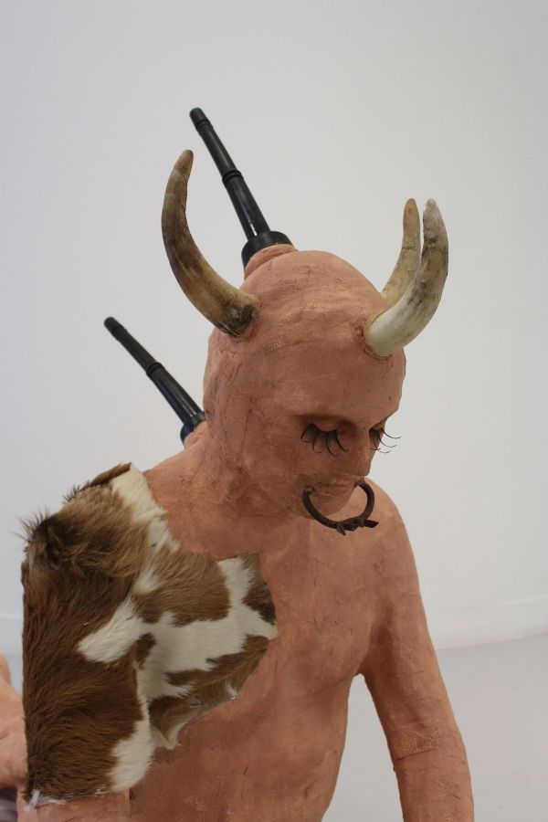 Moulage en plâtre maquillé avec éléments bovins (cornes, boucle d'identification, boucle, peau...)