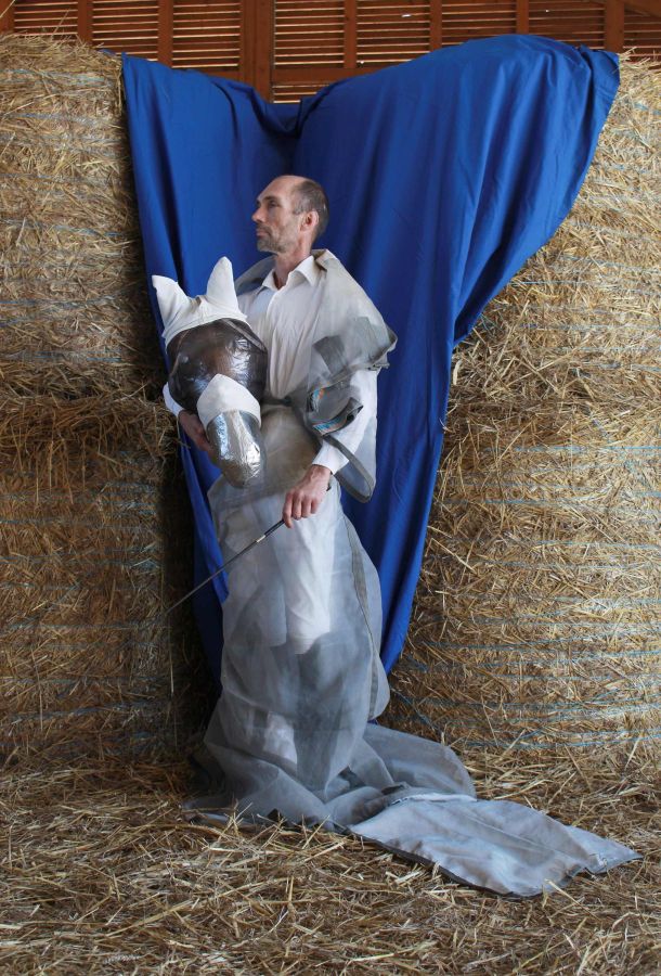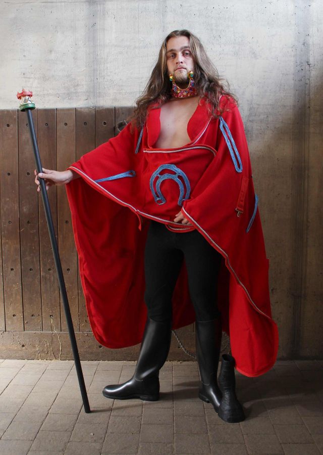 Dans la forge, vêtu d’une cape rouge ornementée de motifs en ficelle agricole bleue, « Éloi maître sur maître, maître sur tous » pose pour un portrait royal. Cette couverture d’écurie détournée, arbore les symboles de la maréchalerie. Enclume, clou, fer et outils deviennent les fleurs de lys de la royauté. En souvenir de cette patte coupée, la botte du cavalier est pied de cheval. Tenant un sceptre surmonté d’un carrousel et paradant avec une couronne autour du cou comme les licornes enluminées, Eloi est fier. Il est fier car sans lui « pas de pied, pas de cheval ».