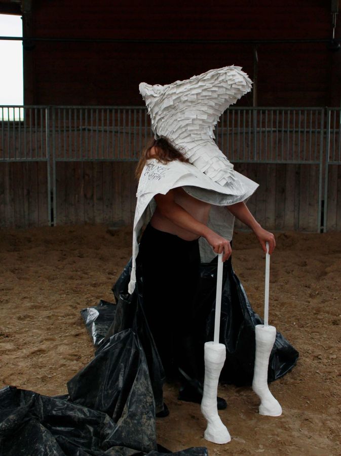 Le cheval ailé est par essence l’image de la liberté. Dans son manège circulaire, les ailes démesurées, la bête de concours est clouée au sol. Le cavalier ne s’élèvera pas. Les mains campées sur ses prothèses. La tête emportée par le poids de sa cagoule. Pégase regarde l’horizon et n’a que pour seul avenir : marcher en cadence.