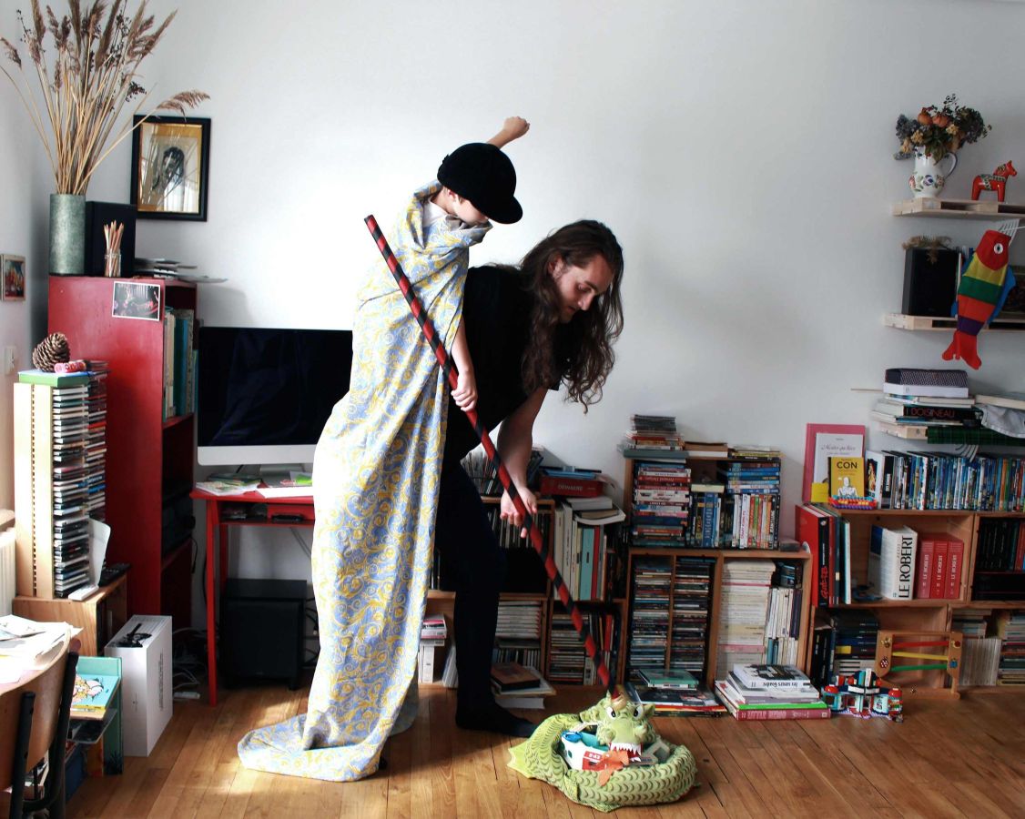 Dans l’intimité d’un salon, un chevalier tue un dragon effrayant tout un village. Dans la rêverie du jeu, un enfant vêtu d’une cape et de sa bombe, sur le dos de son destrier fraternel, armé de sa lance, terrasse sa peluche dragon.