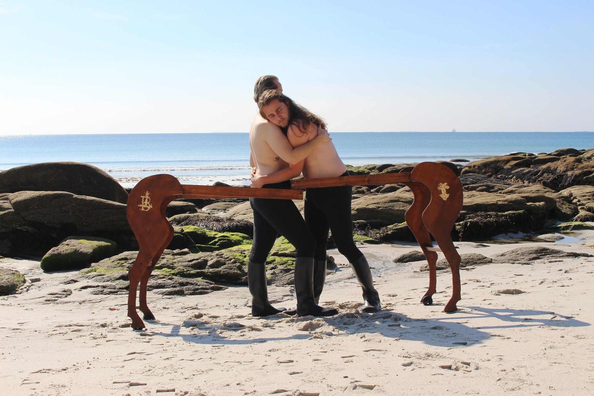 Deux centaures s’enlacent devant l’immensité de la mer. Un écho au monument aux morts vu à Saumur où deux centaures, un gaulois et un poilu, tiennent une couronne de fleurs. Deux arrières trains en bois sur roulettes pour la transformation mythologique. Sur chaque croupe, un cutie mark de petits poneys reprenant les armoiries de l’école de cavalerie et de la maison BouvetLadubay. Face à la mer, deux hommes EQUI (égaux) s’enlacent.
