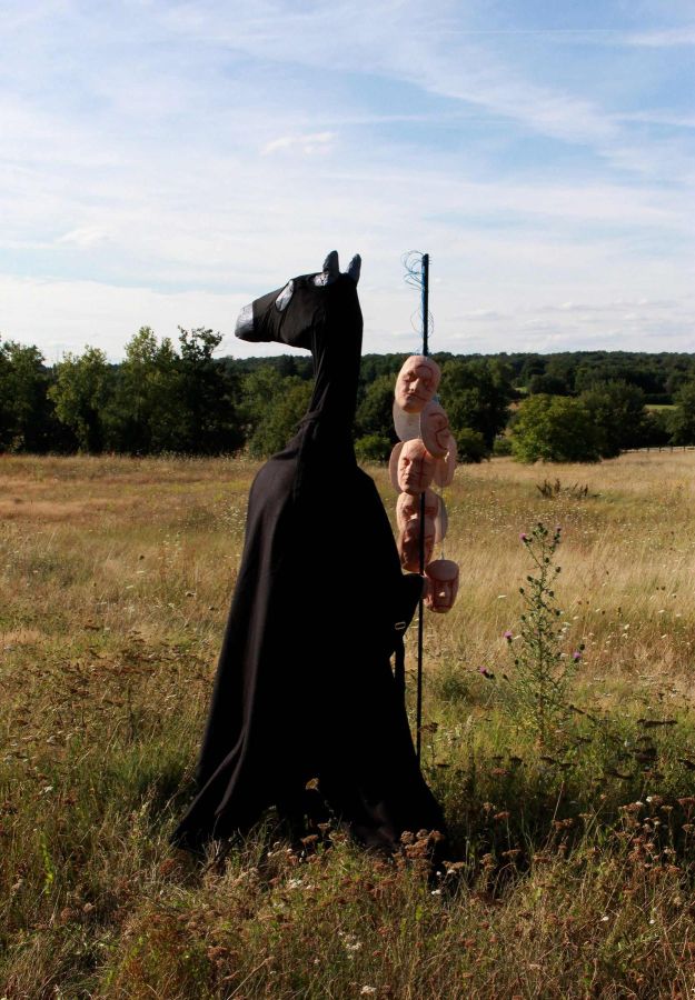 Une sombre et étrange silhouette traverse les prés et scrute l’horizon de la prairie désertée. Le marcheur tient à la main son bâton aux douze visages. Ces masques zodiacaux, évocation du temps passé, des visages capturés et des âmes trépassées. Le cheval est généralement la monture de la mort et du diable. Le bourreau cagoulé, l’Ankou, la Mort sont libres.
