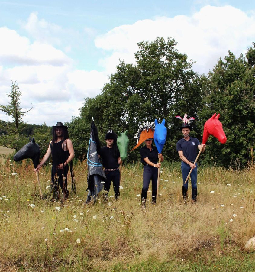 Au loin dans la plaine surgissent quatre cavaliers. Voici les Cavalier.e.s de l’Apocalypse, de grands enfants qui jouent à la guerre. Coiffés de bombes et chapeaux de cow-boy fantaisistes, tenant leurs montures colorées, ils sont prêts à en découdre. Loin de la gravité induite par l’écrit biblique, dans une légèreté enfantine, les codes iconographiques sont là. Un cheval bleu pour la conquête. Un second, rouge pour la guerre. Un noir pour la famine et le dernier, vert pour la mort. La générale porte son bicorne et le porte-étendard est la fierté du régiment. Inspirés par ma visite du musée de la Cavalerie, ces enfants et leurs montures aux couleurs du plateau de jeu sont prêts à lancer la partie.