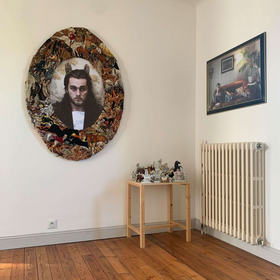 Né du légendaire breton, Marc’h est un roi aux oreilles de cheval. Nombre de ses cousins sont ensorcelés et ont des oreilles voire même des têtes de poulain. Avec ce portrait inspiré de la peinture et de l’architecture saumuroise, nous sommes dans le conte de fée. Ce prince-bête s’offre au regard dans un écrin de canevas. Objet décoratif, ce patchwork de représentations domestiques montre le destrier et sa relation avec l’homme : l’animal dressé, la chasse à courre, la maréchalerie, le cheval de trait, le cheval Delacroix….