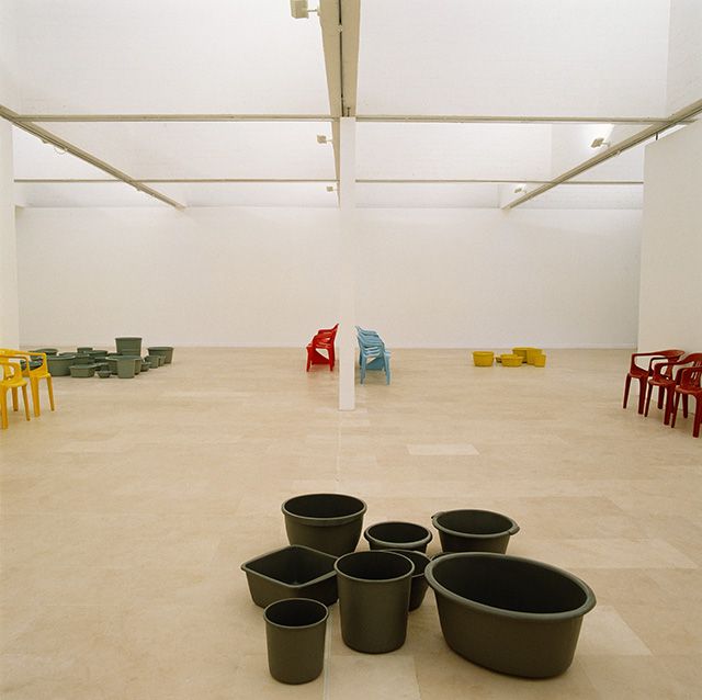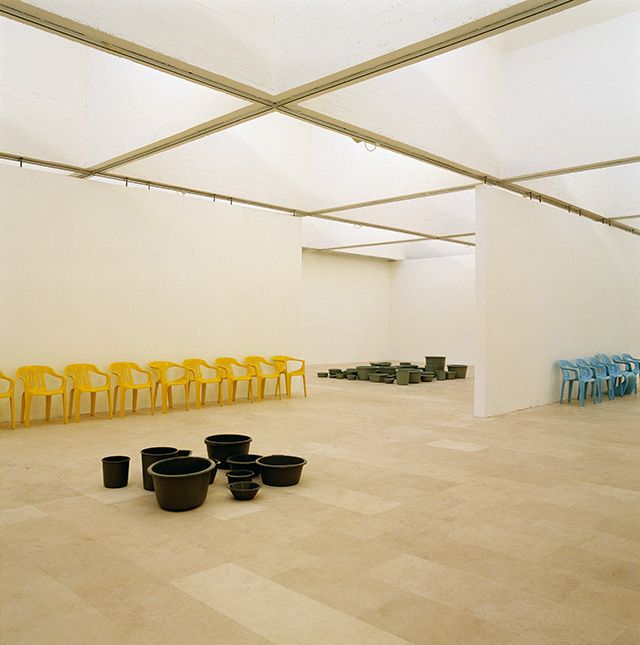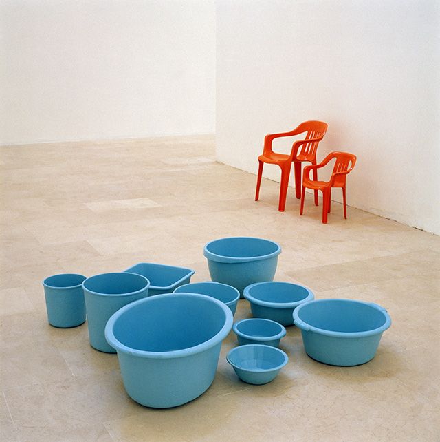 Après avoir moulé une série de bidons à partir d’un modèle identique, celui même qui contenait la résine servant à mouler les objets (un peu comme si la matière se moulait toute seule) et être, par conséquent, parvenu à un système circulaire digne des principes de la pensée borgésienne, l’artiste expérimente la production sérielle dans ce que l’on pourrait nommer une antithèse de ready-made, « chiasme parfait où les états de la matière s’échangent comme les rôles et où la chose se retourne en son image comme un gant(2) ». Par cette subtile théâtralisation du réel, l’artiste fait coïncider formes et fonctions - comme dans le ready-made - puisque le double est aussi bien la projection conceptuelle de l’objet que l’objet en soi si l’on considère qu’il reste utilisable. Pour compliquer ce discours sur le fil du langage, le sculpteur a introduit, depuis 1992, dans ses séries de fauteuils identiques un intrus : « Une chaise de Verner Panton, essaie comme l’androïde face à Blade Runner, de passer inaperçue parmi les chaises de jardin (3) ». Cette différence, à la manière d’un corps étranger infiltré dans un organisme, vient briser la monotonie d’une « re-présentation (4) » qui aurait pu devenir par trop sécurisante. En jouant sur la notion de série et de discontinuité, le plasticien donne lieu à un accident de la vision qui n’est pas sans provoquer un léger sentiment de malaise. Si la série ne fonctionne plus comme une mise en abîme systématique de l’image, l’on est en droit de se demander à quelles autres déviations plastiques cette résine protéiforme pourra bien donner lieu. Il faut dire qu’Étienne Bossut avait déjà introduit dans son petit monde bien familier (peut-être trop pour être innocent ?) de doubles d’objets un élément perturbateur constitué de cette couleur vive et inhabituelle qui nous faisait nous attacher à ses simulacres plus qu’à de véritables objets, un peu comme s’il nous fallait éternellement réinventer le réel pour l’adapter à une dimension autre. Parallèlement à ses poétiques présences muettes que sont les fauteuils, le sculpteur présente à la Villa Arson une série de curieuses - parce qu’anodines gamelles - dont l’installation à même le sol, telle une tache colorée, semble se faire l’écho des véritables bassines et autres fragments plastiques de l’univers ménager de son collègue d’outre-manche Tony Cragg5. Étienne Bossut, dont le travail avait déjà été présenté, en 1987, à la Villa Arson où il avait exposé dans la Galerie de l’École des baignoires moulées sur lesquelles était posé de biais, non sans impertinence, leur volume d’eau respectif saisi comme autant de pains de glace, nous livre ici un travail d’une teneur nouvelle. Il semble bien, en effet, que le plasticien ait décidé de prendre une certaine distance par rapport à l’objectivité en laissant transparaître le procédé de moulage de sa sculpture. Si auparavant l’on pouvait déjouer le leurre en devinant la présence de la couture du moule par le simple fait de contourner ses objets, avec les gamelles l’on est en face de la mise en œuvre d’un antagonisme frappant entre avers et revers, entre surface lisse et rugueuse, puisque les bassines affichent sans retenue la porosité du moule sur leur pourtour externe. Au-delà de la qualité des jeux de matière obtenus, il ressort de ce processus de retournement plastique un effet de démenti plus rapide et percutant que dans les pièces précédentes qui ouvre la voie à toute une interrogation de l’œuvre sur elle-même.