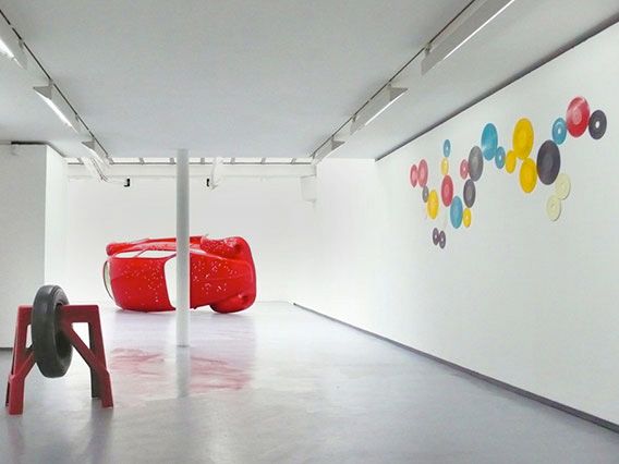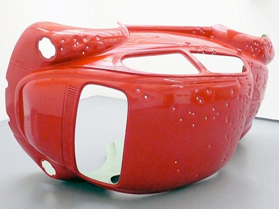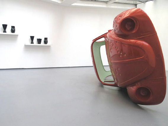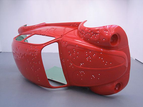 Pas ce soir peut se lire comme un hommage à un rêve de société révolu auquel l’automobile appartenait. Une coque du modèle original de la Coccinelle Volkswagen criblée de balles 9mm a été moulée à l’identique. Présentée couchée sur le côté droit, elle a l’image d’une barricade urbaine dressée ou d’un monument désaffecté à la gloire d’une autre époque ; l’image emblématique de l’automobile rouge prend forme d’après nature. L’intérieur de couleur verte met en exergue les impacts sur la carrosserie. Elle apparaît comme un double, une trace immuable, telle qu’elle est désormais, une preuve de ce qu’elle était. Le moulage en plastique la distancie du poids de la réalité pour créer une image plus légère, plus ludique. Pourtant au-delà de l’apparence, il s’agit bien d’une voiture à échelle 1, d’un mythe disparu.
