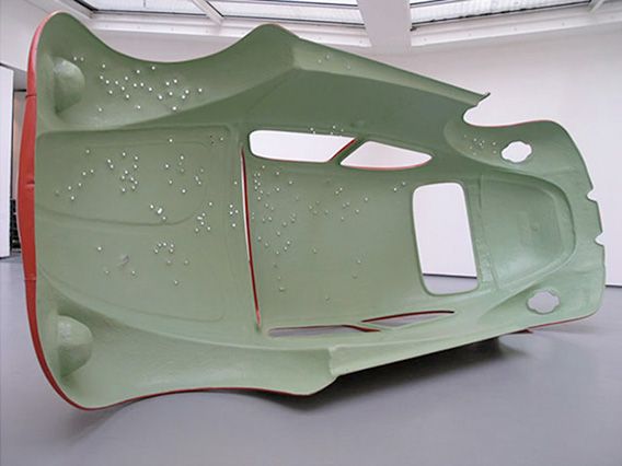 Oui mais voilà : le temps des voitures est fini. Il y a bien longtemps que les ingénieurs ont renoncé au génie dans ce domaine. Toutes les automobiles désormais se ressemblent, toutes sont dessinées par des ordinateurs, qui font des variations sur le thème de la fausse Volkswagen (je suis sûr que dans les paramètres évoqués plus haut, on inclut dans le plus grand secret celui ci : introduire une petite différence avec la forme parfaite de la VW). Et de même que pour Marx les grands événements de l’histoire se répètent en farce, la nouvelle Coccinelle dessinée par la firme Volkswagen reproduit l’original sous la forme du jouet : le fantôme de Ferdinand Porsche, retombé en enfance, a redessiné son chef-d’œuvre en Playmobil cela reste moins laid que la plupart des voitures modernes, mais très en deça du modèle. Au surplus, nous savons tous que les réserves de pétrole ne sont pas éternelles, que si tous les habitants de la planète s’équipaient de voitures nous étoufferions bientôt sous les gaz toxiques, en bref que la voiture est un épisode clos, ou près de l’être, de l’histoire de l’humanité. Nous devons lui faire nos adieux, à cette automobile que nous avons tant désirée. Mais des adieux dignes, elle a trop compté pour qu’on l’envoie à la ferraille ou à l’hospice. Etienne Bossut a pris la décision qui s’imposait : la Coccinelle ne devait pas être compactée dans un compresseur de vieilles voitures, ni démontée pour fabriquer des casseroles. Il fallait l’achever en effigie comme un Cow-Boy achève son cheval, symboliquement d’une balle dans la peau. Mais la bête était robuste, il aura fallu plusieurs coups de feu, et sur la fausse carcasse moulée par Bossut on pourrait compter cent cinquante impacts, l’éclat des projectiles dessine comme une voûte étoilée : ce conducteur hors pair aura donc quand même réussi dans sa vie à fusiller une bagnole… Quand Étienne Bossut m’a parlé de ce monument paradoxal, j’ai entendu son titre (Pas ce soir ) comme une évocation de l’adieu, sans poser plus de questions l’homophonie approximative qui conduit de pas ce soir à passoire m’a ainsi tout d’abord échappé (une honte pour un admirateur de Raymond Roussel). Mais j’ai une excuse : c’est qu’on l’a aimée, cette saloperie de Coccinelle, si mal née - et pourtant si fière, et si jolie.