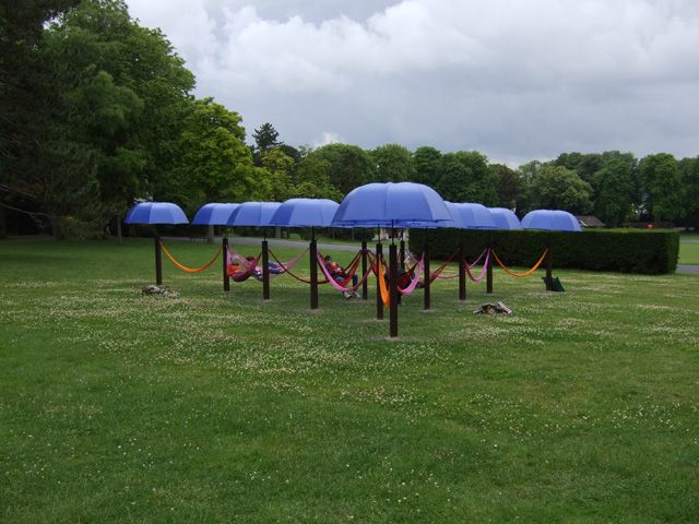 Sieste collective, _2007 13 piquets en bois peints, 15 hamacs en filets nylon, 13 parapluies en nylon