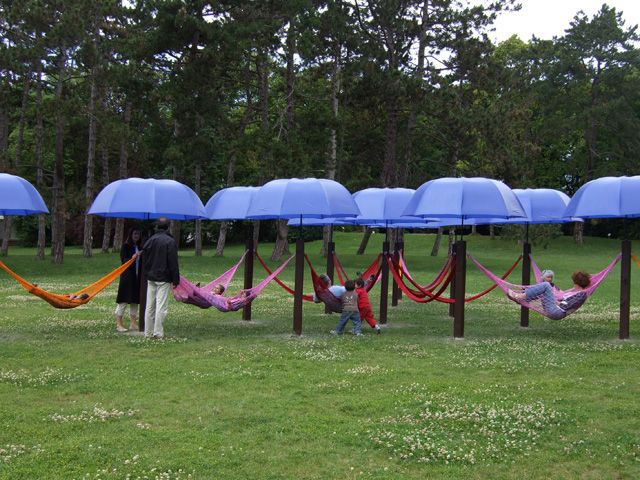 Sieste collective est un dispositif de sieste en forme de ramification, qui, posé dans un parc public, suggère à 15 personnes une petite sieste collective mélant somnolence et conversations selon la place choisie au grès de son balancement et de son désir. Des grands parapluies bleus abritent du soleil et de la pluie.