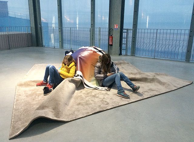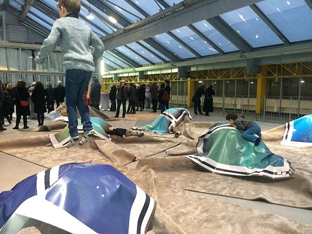Vague à l’âme II est un espace de repos fainéant qui incarne l’abandon. Des formes énigmatiques contraignent les tapis de laine pour inciter les visiteurs à se lover dans les plis et le replis.