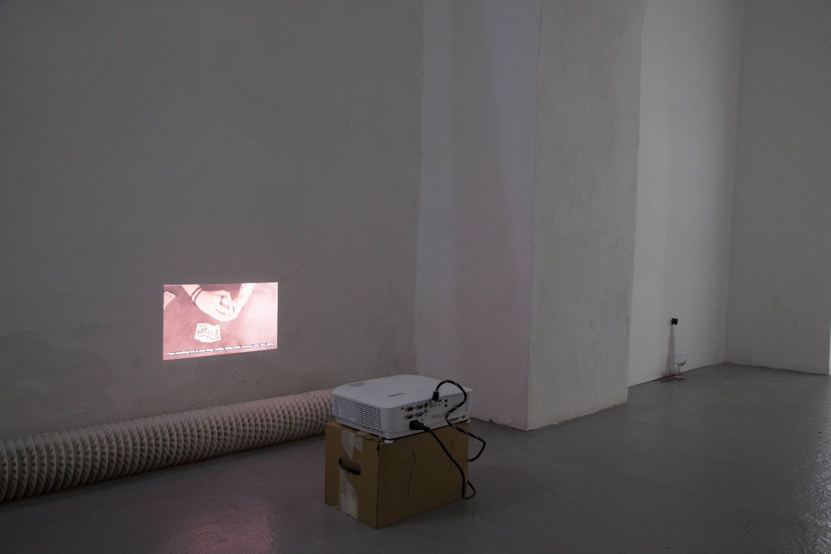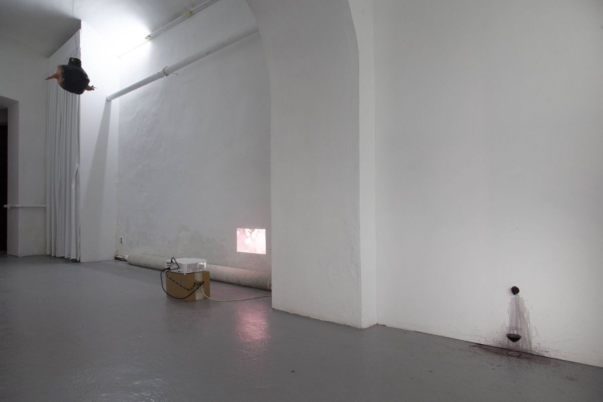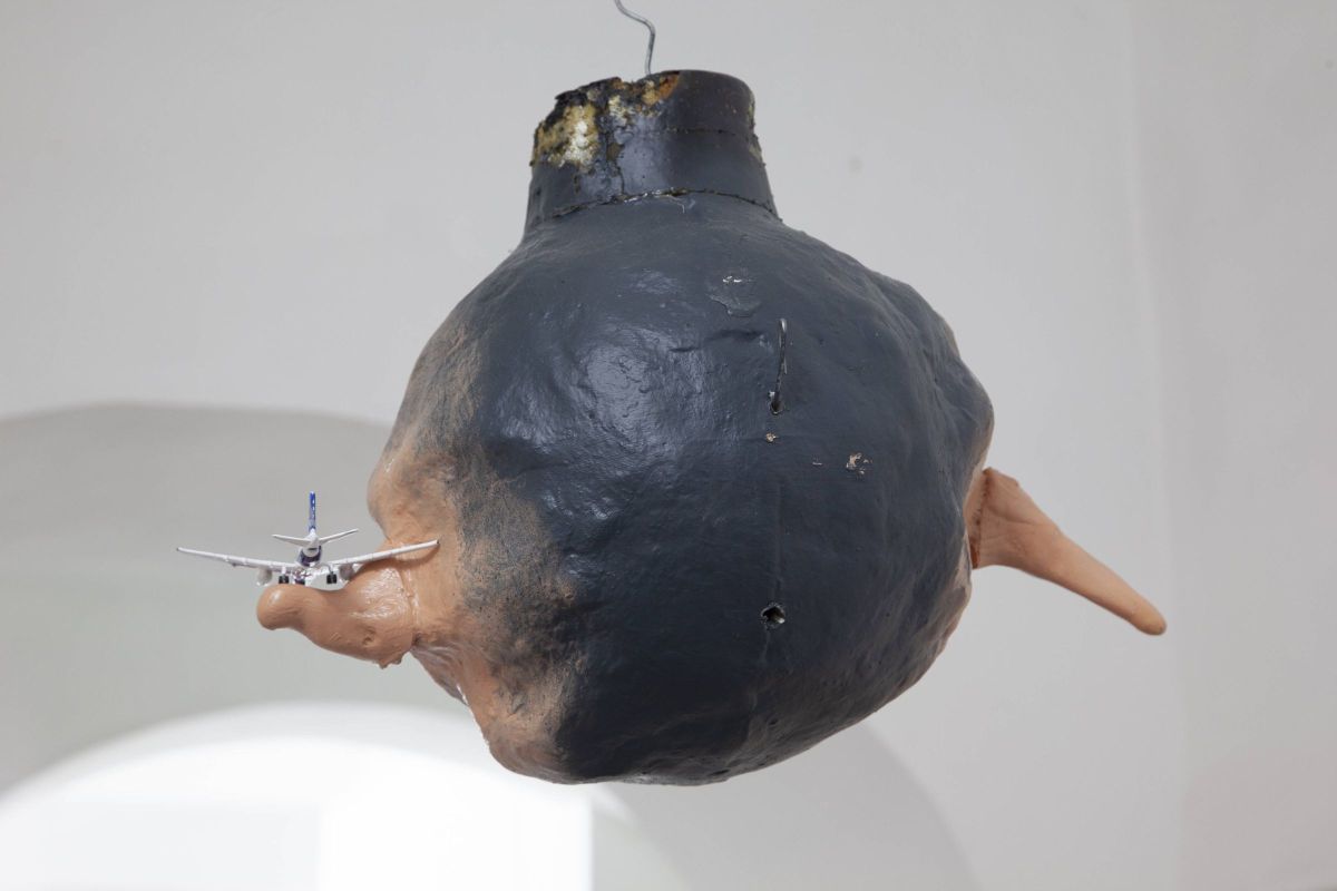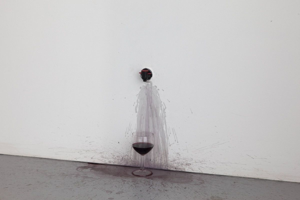 Vues de l’installation Des avions dans la tête, vidéo muette de 10 minutes, plâtre, avion, vin rouge et bactéries, 2020