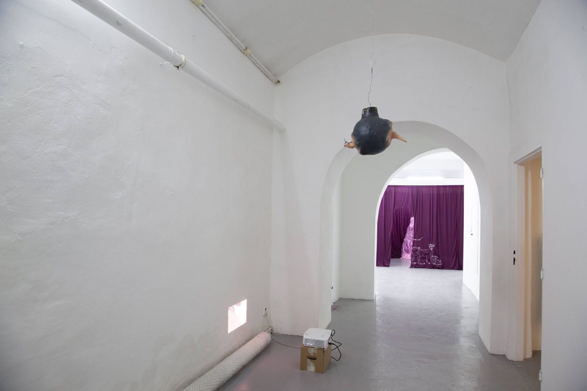 Extrait du texte (traduis en français) : Cette voix sourde doit résonner dans l’exposition, même imperceptiblement. Cette voix est la voix de l’atelier, la voix que vous ne pouvez pas entendre. Un courant d’air sur les fibres synthétiques de ma perruque et j’entends les bruits du garage d’en face et les hirondelles qui se réveillent. Il suffit d’un objet pour mettre une chaîne en mouvement, il y en a toujours un qui scelle ce qui vient avant lui. Quatre couleurs, le violet, le bleu, le rouge et le vert. Il vient souvent faire des tours de magie. Le magicien travaille pour moi, il me semble qu’il est coiffeur. Les cartes changent, vibrent, se transforment sans rien produire. L’autre, l’artiste vient plus souvent. Il dérange et range. Mais c’est peut-être la même personne. Après tout, ils se ressemblent un peu. Il y a tout ici pour faire des choses, des tréteaux, des tables pliantes, des toiles, de la peinture, de la résine, du plâtre, des gommes et des avions dans la tête. Il n’y a pas de public, mais cela n’a pas d’importance. Il existe par lui-même. Il existe pour moi. C’est de l’art. C’est comme la magie. Cela existe aussi sans public.