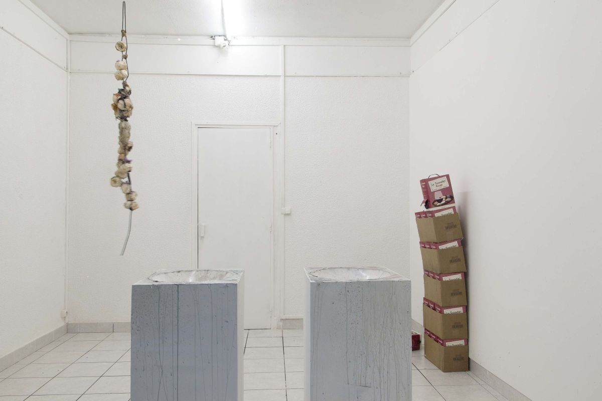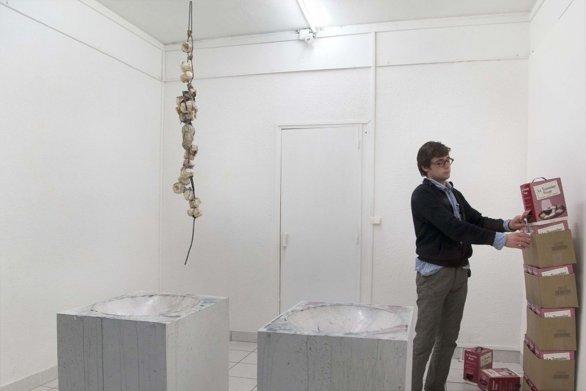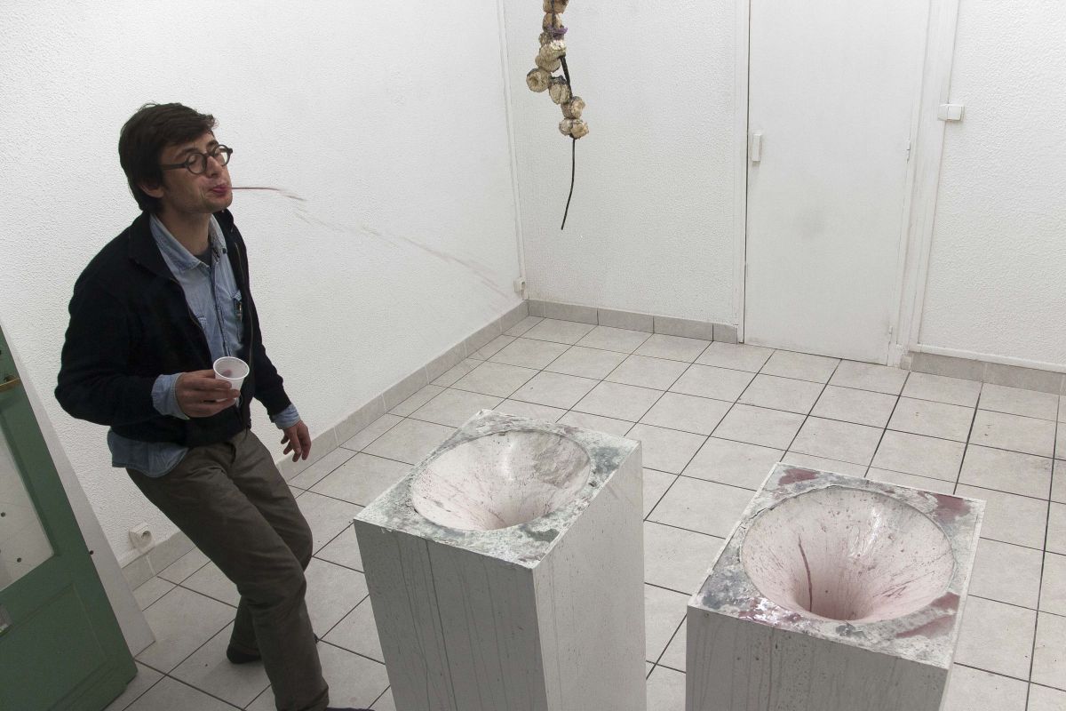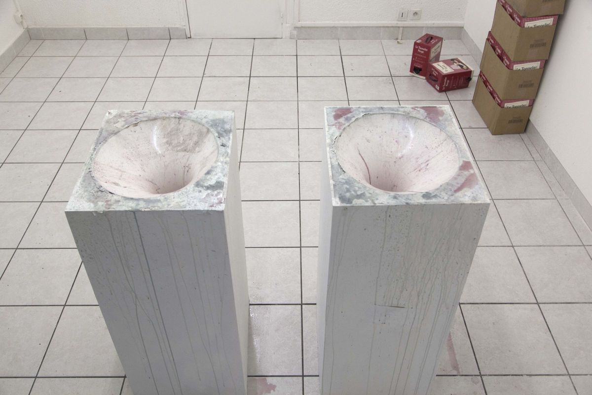 Deux crachoirs sont présentés avec une centaine de litres de vin rouge en cubitainer. Le public est invité à cracher du vin dans les sculptures construites à partir de moulages d’une chaise de bar.