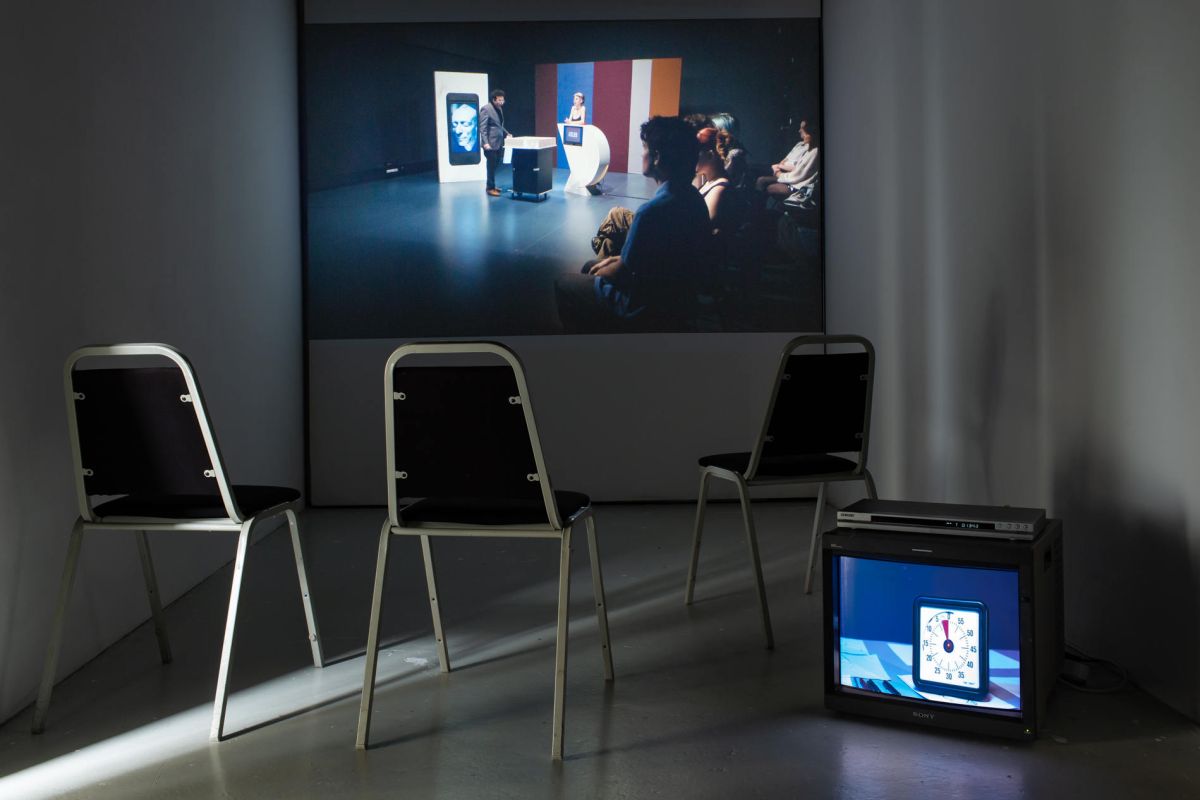 Questions pour personnages actuels et futurs est un jeu télévisé tourné en public, dont la forme rappelle celle d’une pièce de théâtre. Ce jeu se déroule dans un monde dystopique où la culture, en particulier la littérature, a remplacé l’argent. Le tournage de la vidéo reprend tous les codes et les plans d’un jeu télévisé classique. Il faut imaginer un double plateau, tel une ruche où chacun joue son rôle. À côté du plateau principal, se trouve une antichambre, une salle d’attente, un second plateau où se déroulent des activités artistiques. Des acteurs et figurants en costumes illustrent divers métiers comme magicien·ne, cuisinier·ère, peintre, sculpteur·e, etc. Les candidats (parmi lesquels on compte trois sculptures) attendent dans l’antichambre. L’ambiance y est froide, silencieuse. Certain·e·s lisent, d’autres réfléchissent, tandis que d’autres encore ne font rien. L’antichambre apparaît comme un purgatoire parfait.