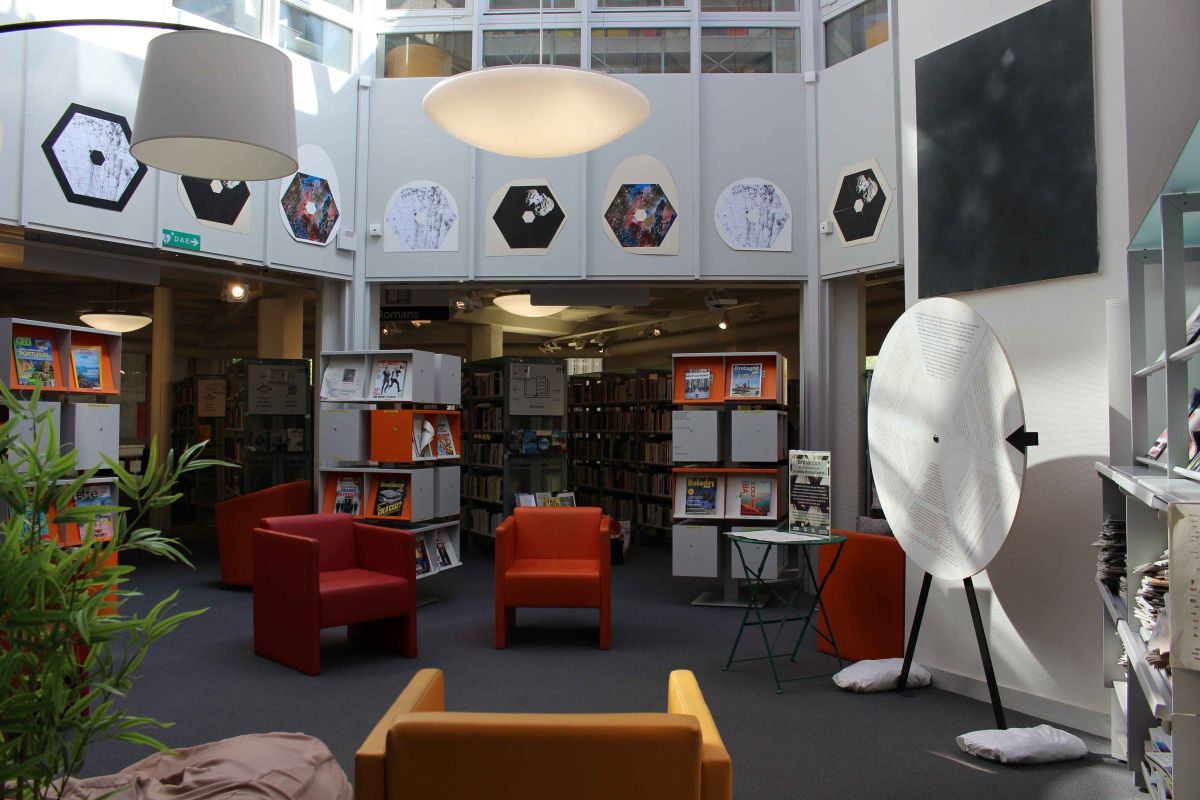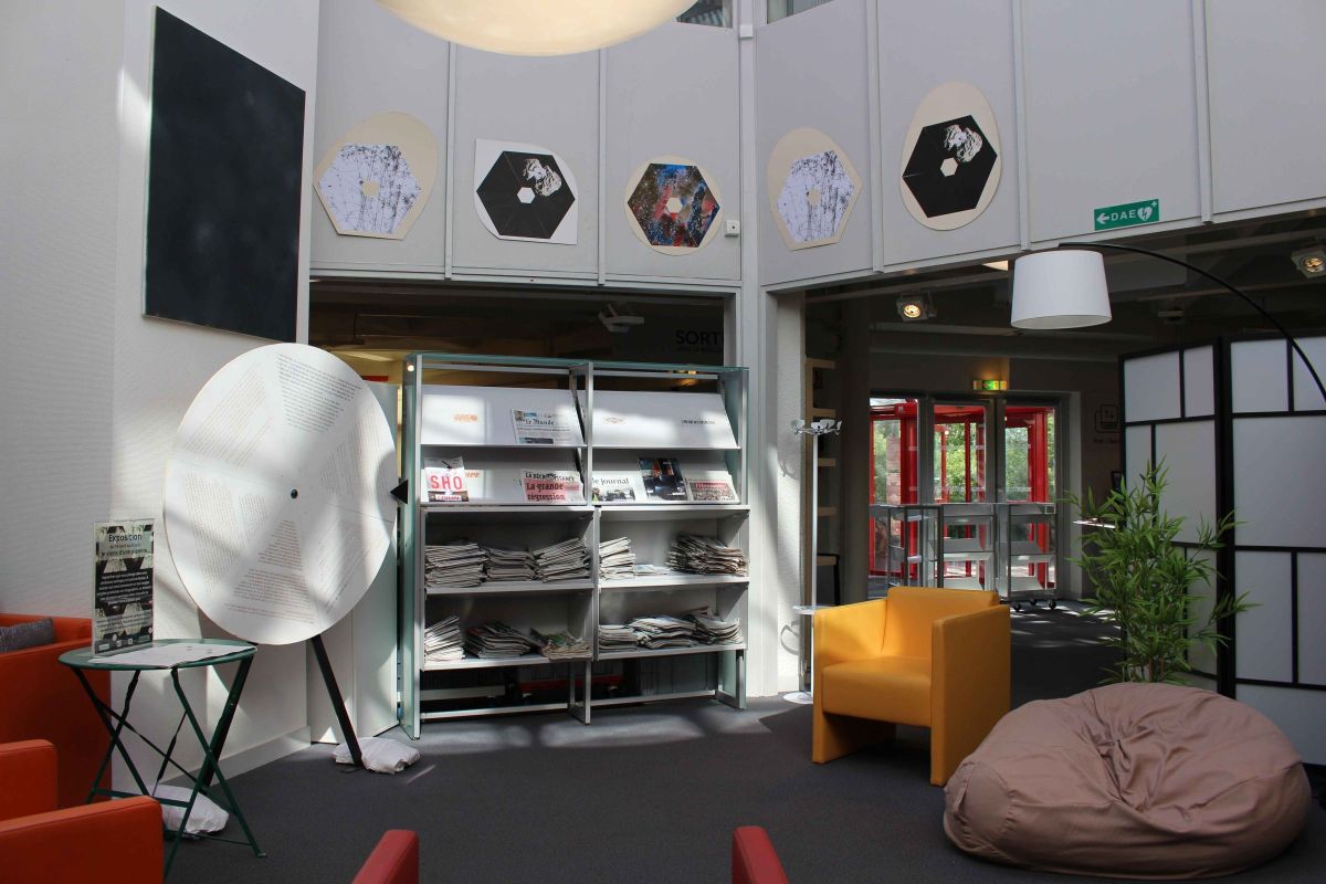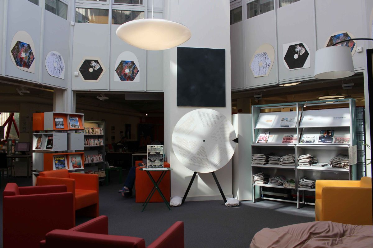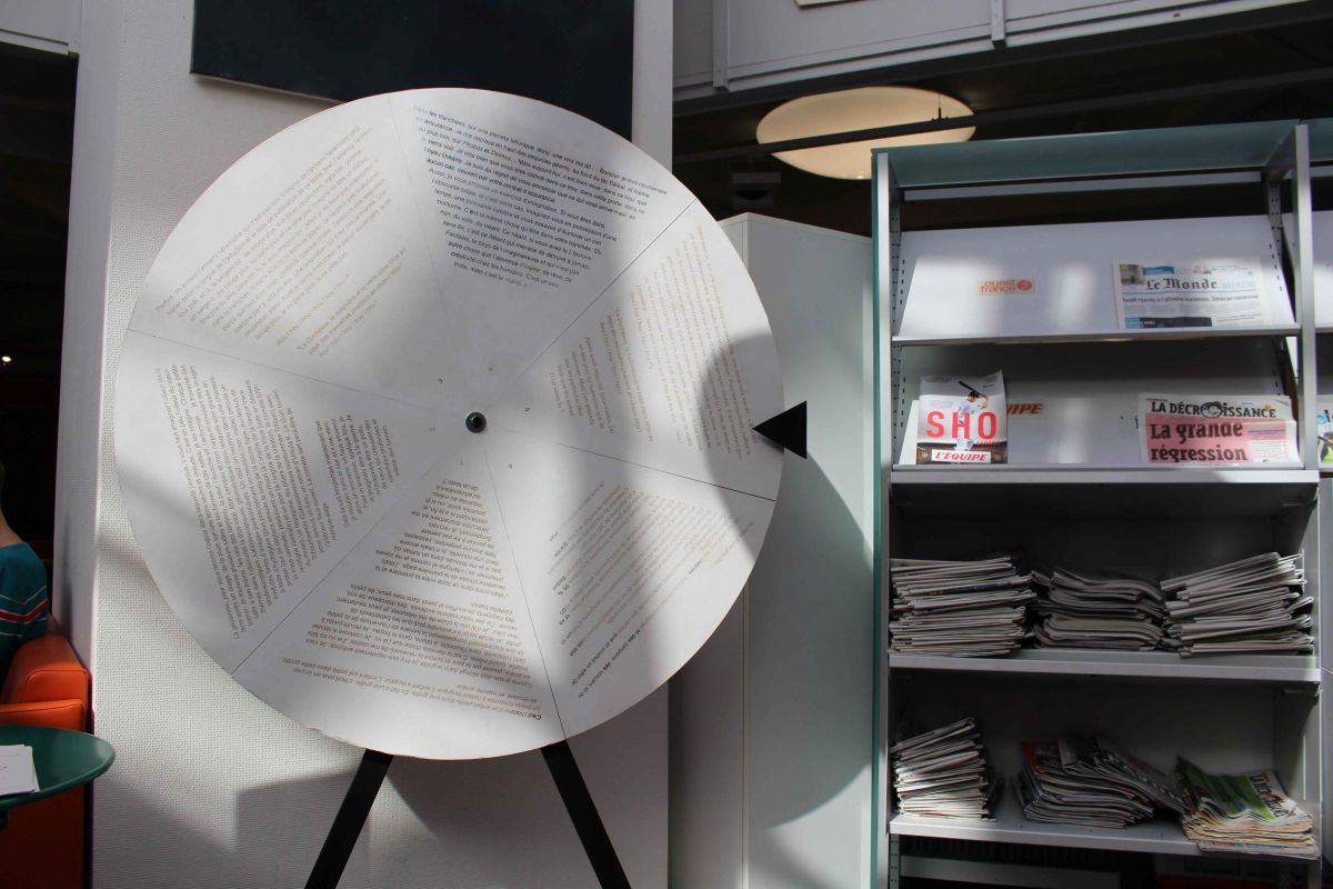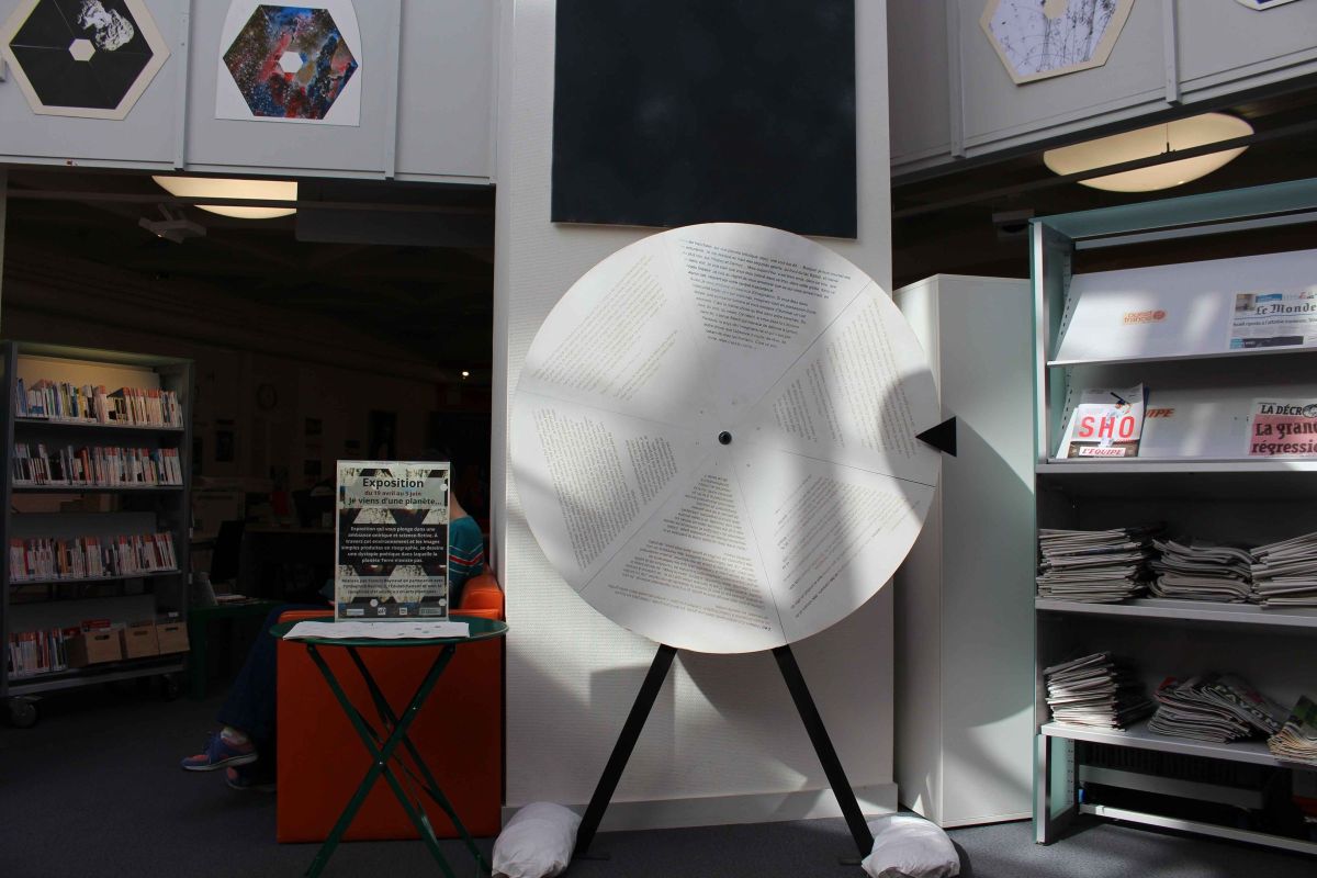 L’exposition fait écho aux hexagones sur lesquels est basée l’architecture du bâtiment du Triangle. Les œuvres imprimées en risographie sont réalisées sur six feuilles assemblées en forme d’hexagone. Les six pages du conte que j’ai écrit sont gravées sur six panneaux disposés sur une roue. Cette roue, installée au cœur de la bibliothèque, est un objet à lire.