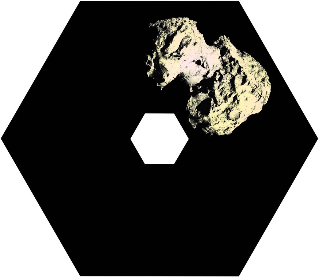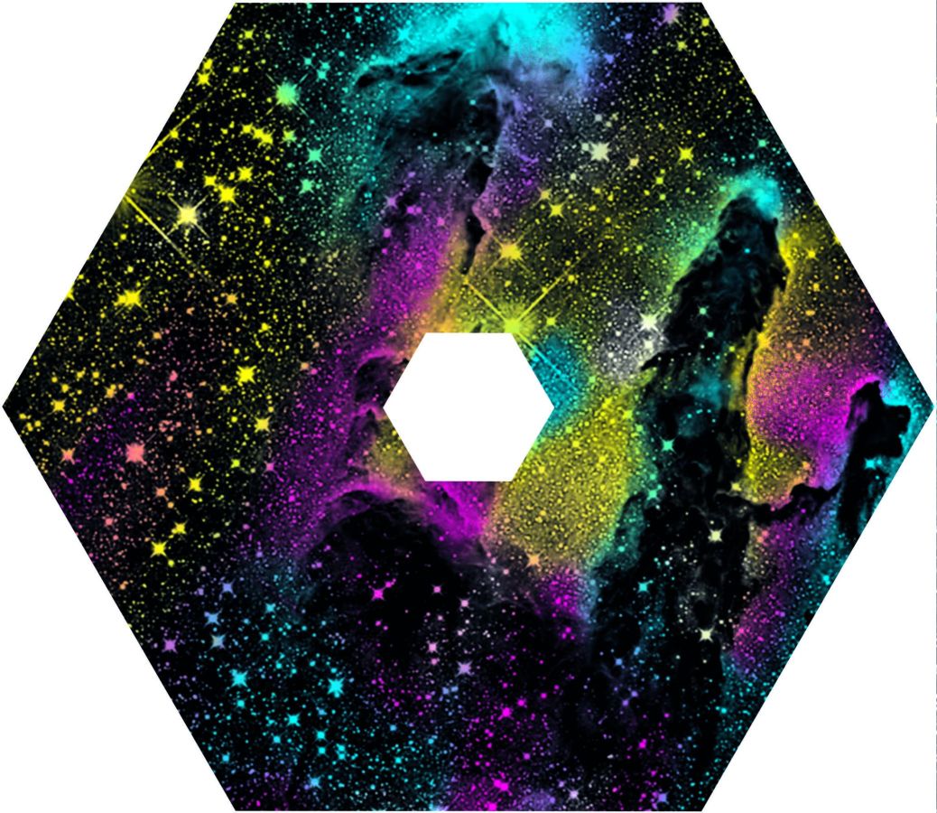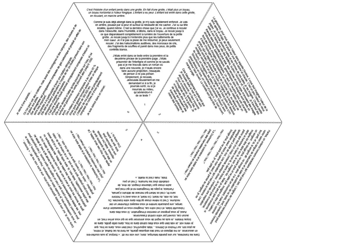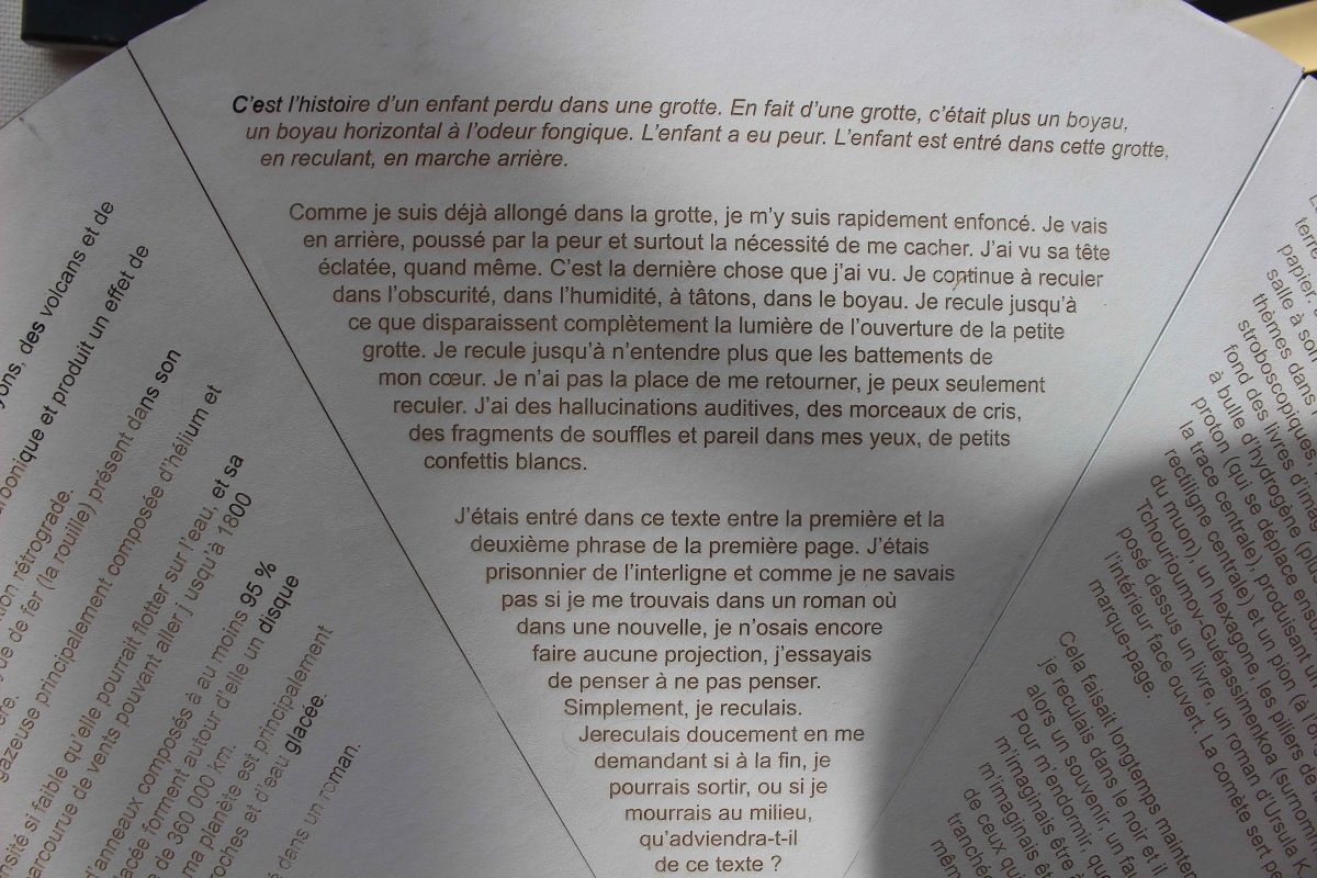 L’exposition fait écho aux hexagones sur lesquels est basée l’architecture du bâtiment du Triangle. Les œuvres imprimées en risographie sont réalisées sur six feuilles assemblées en forme d’hexagone. Les six pages du conte que j’ai écrit sont gravées sur six panneaux disposés sur une roue. Cette roue, installée au cœur de la bibliothèque, est un objet à lire.